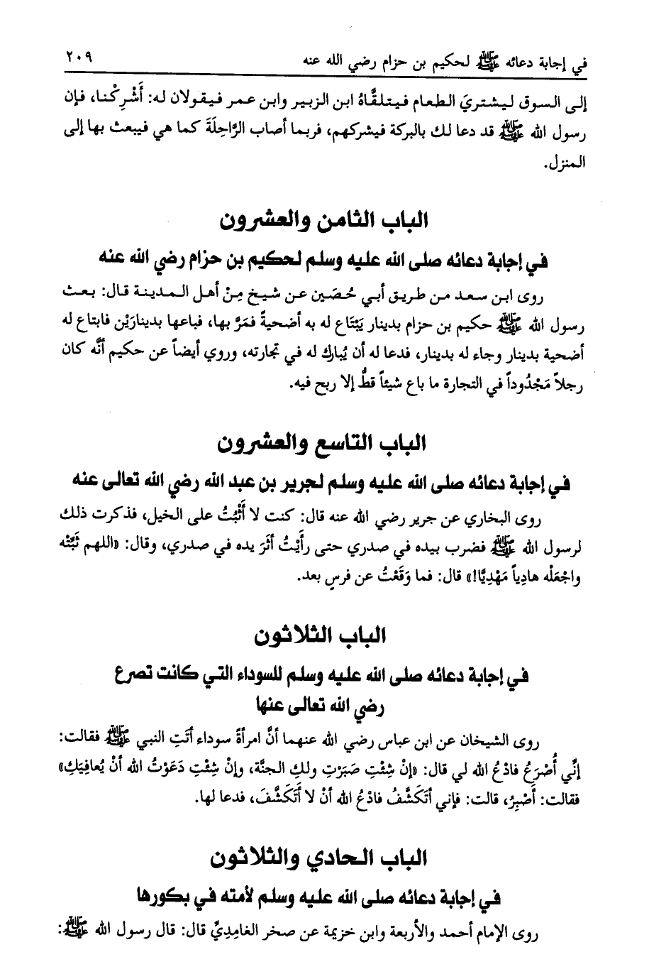 الباب الثلاثون في إجابة دعائه صلى الله عليه وسلم للسوداء التي كانت تصرع رضي الله تعالى عنها