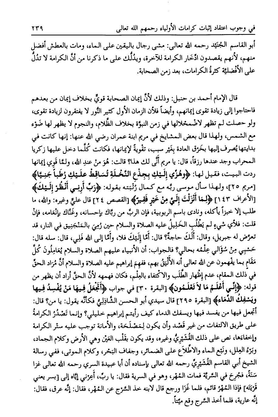 أبو القاسم الجنيد رحمه الله تعالى: مشى رجال باليقين على الماء، ومات بالعطش أفضل منهم، لأنهم يقصدون ادخار الكرامة للآخرة، ويدلك على ما ذكرنا من أن الكرامة لا تدل على الأفضلية كثرة الكرامات، بعد زمن الصحابة.