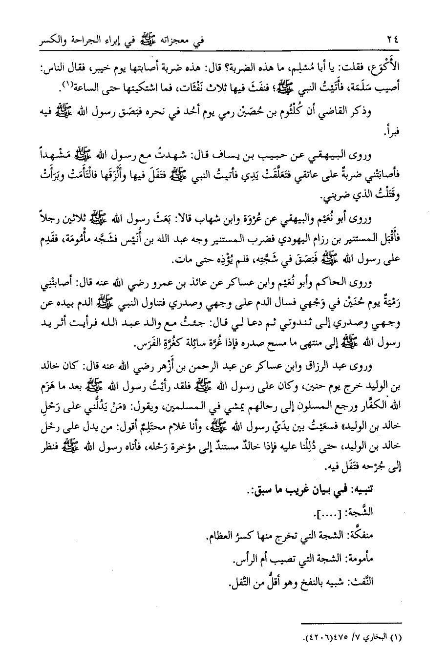 وذكر القاضي أن كلثوم بن حصين رمي يوم أحد في نحره فبصق رسول الله صلى الله عليه وسلم فيه فبرأ.