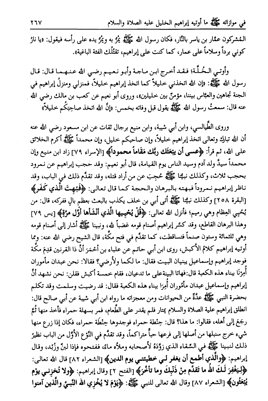 وروى الطيالسي، وابن أبي شيبة، وابن منيع برجال ثقات عن ابن مسعود رضي الله عنه أن الله تبارك وتعالى اتخذ إبراهيم خليلا، وإن صاحبكم خليل، وان محمدا صلى الله عليه وسلم أكرم الخلائق على الله، ثم قرأ: عَسى أَنْ يَبْعَثَكَ رَبُّكَ مَقاماً مَحْمُوداً [الإسراء 79] زاد ابن منيع وإن محمدا سيد ولد آدم وسيد الناس يوم القيامة، قال أبو نعيم: وقد حجب إبراهيم عن نمرود بحجب ثلاث، وكذلك نبينا صلى الله عليه وسلم حجب عن من أراد قتله، وقد تقدم ذلك في الباب، وقد ناظر إبراهيم نمرودا فبهته بالبرهان والحجة كما قال تعالى: فَبُهِتَ الَّذِي كَفَرَ [البقرة 258] وكذلك نبينا صلى الله عليه وسلم أتى أبي بن خلف يكذب بالبعث بعظم بال ففركه، قال: من يحيي العظام وهي رميم، فأنزل الله تعالى: قُلْ يُحْيِيهَا الَّذِي أَنْشَأَها أَوَّلَ مَرَّةٍ [يس 79] وهذا البرهان القاطع، وقد كسر إبراهيم أصنام قومه غضبا لله، ونبينا صلى الله عليه وسلم أشار إلى أصنام قومه وهي ثلاثمائة وستون صنما فتساقطت، كما تقدم في فتح مكة، قال الشيخ رضي الله عنه: ومما أوتيه إبراهيم كلام الأكبش، روى ابن أبي حاتم عن علباء بن أحمر أن ذا القرنين قدم مكة فوجد إبراهيم وإسماعيل يبنيان البيت فقال: ما لكما ولأرضي؟ فقالا: نحن عبدان مأموران أمرنا ببناء هذه الكعبة قال: فهاتا البينة على ما تدعيان، فقام خمسة أكبش فقلن: نحن نشهد أنّ بحضرة النبي صلى الله عليه وسلم عدة من الحيوانات ومن معجزاته ما رواه ابن أبي شيبة عن أبي صالح قال: