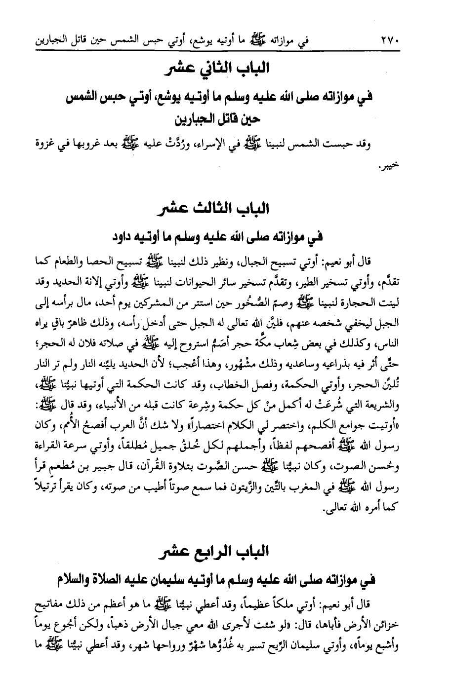الباب الثاني عشر في موازاته صلى الله عليه وسلم ما أوتيه يوشع، أوتي حبس الشمس حين قاتل الجبارين