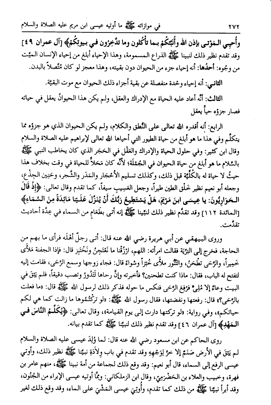 الرابع: أنه أقدره الله تعالى على النطق والكلام، ولم يكن الحيوان الذي هو جزؤه مما يتكلم وفي هذا ما هو أبلغ من حياة الطيور التي أحياها الله تعالى لإبراهيم عليه الصلاة والسلام وقال ابن كثير: وفي حلول الحياة والإدراك والعقل في الحجر الذي كان يخاطب النبي صلى الله عليه وسلم بالسلام ما هو أبلغ من حياة الحيوان في الجملة، لأنه كان محلا للحياة في وقت بخلاف هذا حيث لا حياة له بالكلية قبل ذلك، وكذلك تسليم الأحجار والمدر والشجر، وحنين الجذع، وجعله أبو نعيم نظير خلق الطين طيرا، وجعل العسيب سيفا، كما تقدم وقال تعالى: إِذْ قالَ الْحَوارِيُّونَ: يا عِيسَى ابْنَ مَرْيَمَ، هَلْ يَسْتَطِيعُ رَبُّكَ أَنْ يُنَزِّلَ عَلَيْنا مائِدَةً مِنَ السَّماءِ [المائدة 112] وقد تقدم نظير ذلك لنبينا صلى الله عليه وسلم إنه أتى بطعام من السماء في عدة أحاديث تقدمت.