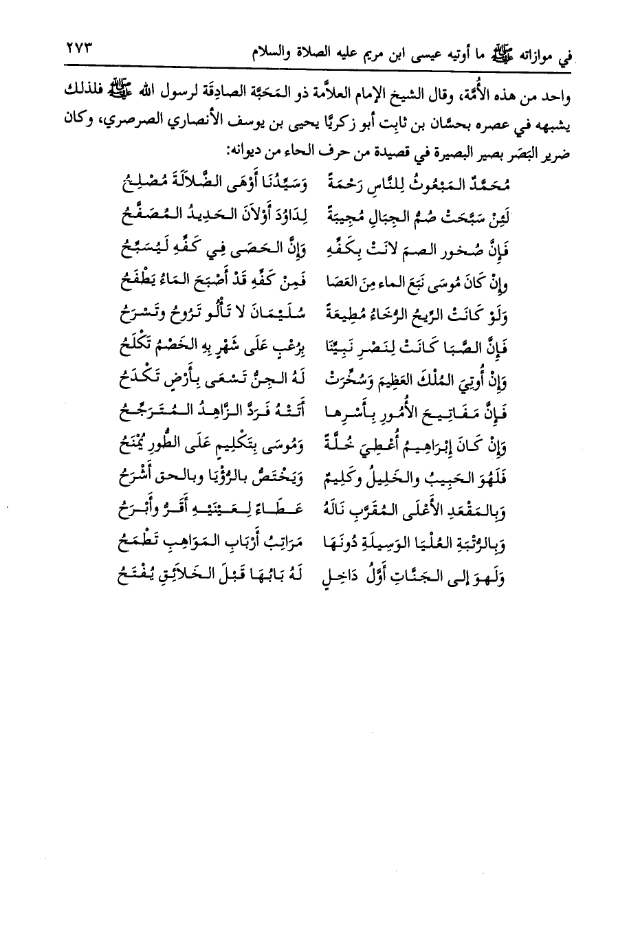 واحد من هذه الأمة، وقال الشيخ الإمام العلامة ذو المحبة الصادقة لرسول الله صلى الله عليه وسلم فلذلك يشبهه في عصره بحسان بن ثابت أبو زكريا يحيى بن يوسف الأنصاري الصرصري، وكان ضرير البصر بصير البصيرة في قصيدة من حرف الحاء من ديوانه: