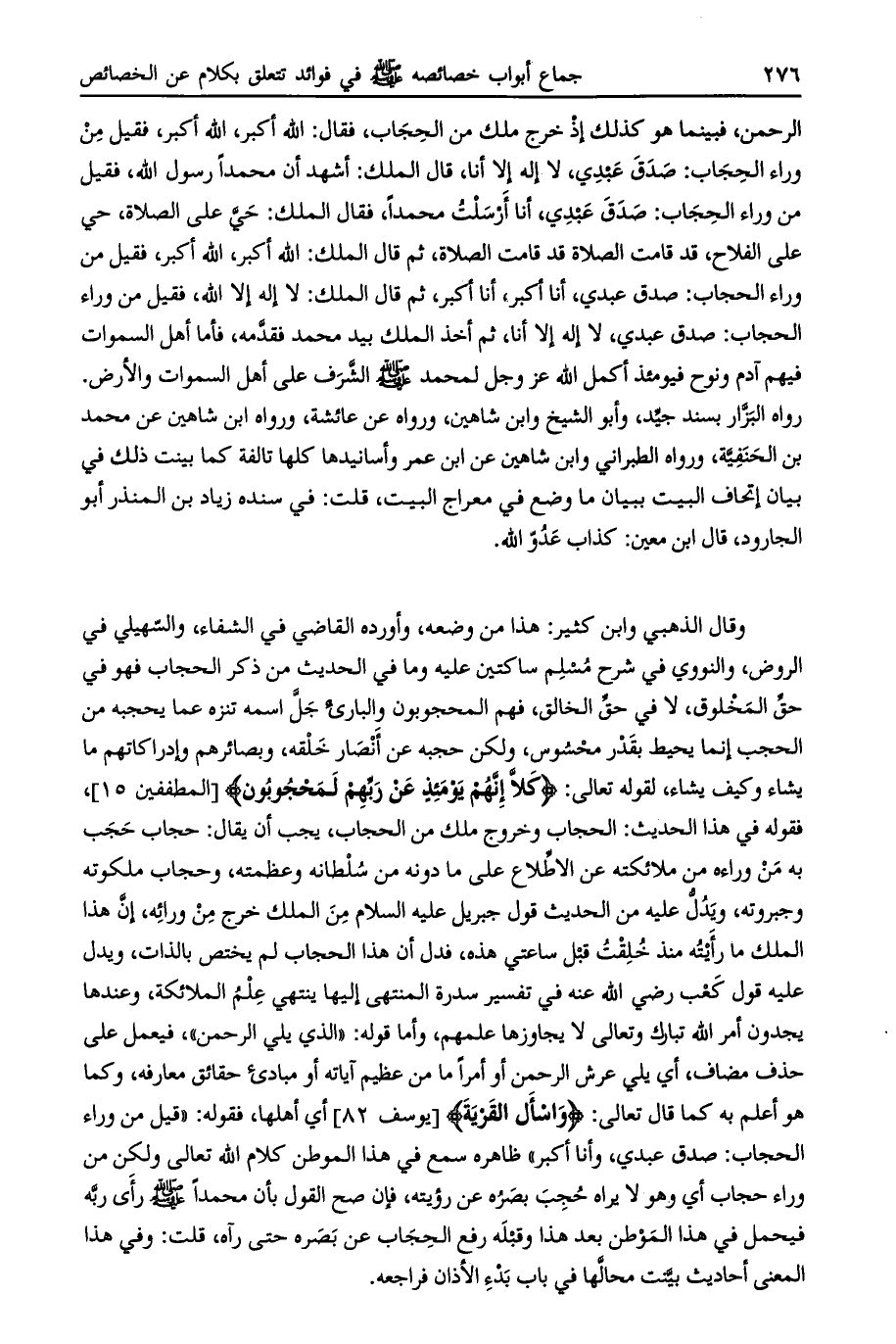 وقال الذهبي وابن كثير: هذا من وضعه، وأورده القاضي في الشفاء، والسهيلي في الروض، والنووي في شرح مسلم ساكتين عليه وما في الحديث من ذكر الحجاب فهو في حق المخلوق، لا في حق الخالق، فهم المحجوبون والبارئ جل اسمه تنزه عما يحجبه من الحجب إنما يحيط بقدر محسوس، ولكن حجبه عن أنصار خلقه، وبصائرهم وإدراكاتهم ما يشاء وكيف يشاء، لقوله تعالى: كَلَّا إِنَّهُمْ عَنْ رَبِّهِمْ يَوْمَئِذٍ لَمَحْجُوبُونَ [المطففين 15] ، فقوله في هذا الحديث: الحجاب وخروج ملك من الحجاب، يجب أن يقال: حجاب حجب به من وراءه من ملائكته عن الاطلاع على ما دونه من سلطانه وعظمته، وحجاب ملكوته وجبروته، ويدل عليه من الحديث قول جبريل عليه السلام من الملك خرج من ورائه، إن هذا الملك ما رأيته منذ خلقت قبل ساعتي هذه، فدل أن هذا الحجاب لم يختص بالذات، ويدل عليه قول كعب رضي الله عنه في تفسير سدرة المنتهى إليها ينتهي علم الملائكة، وعندها يجدون أمر الله تبارك وتعالى لا يجاوزها علمهم، وأما قوله: «الذي يلي الرحمن» ، فيعمل على حذف مضاف، أي يلي عرش الرحمن أو امرا ما من عظيم آياته أو مبادئ حقائق معارفه، وكما هو أعلم به كما قال تعالى: وَسْئَلِ الْقَرْيَةَ [يوسف 82] أي أهلها، فقوله: «قيل من وراء الحجاب: صدق عبدي، وأنا أكبر» ظاهره سمع في هذا الموطن كلام الله تعالى ولكن من وراء حجاب أي وهو لا يراه حجب بصره عن رؤيته، فإن صح القول بأن محمدا صلى الله عليه وسلم رأى ربه فيحمل في هذا الموطن بعد هذا وقبله رفع الحجاب عن بصره حتى رآه، قلت: وفي هذا المعنى أحاديث بينت محالها في باب بدء الأذان فراجعه.