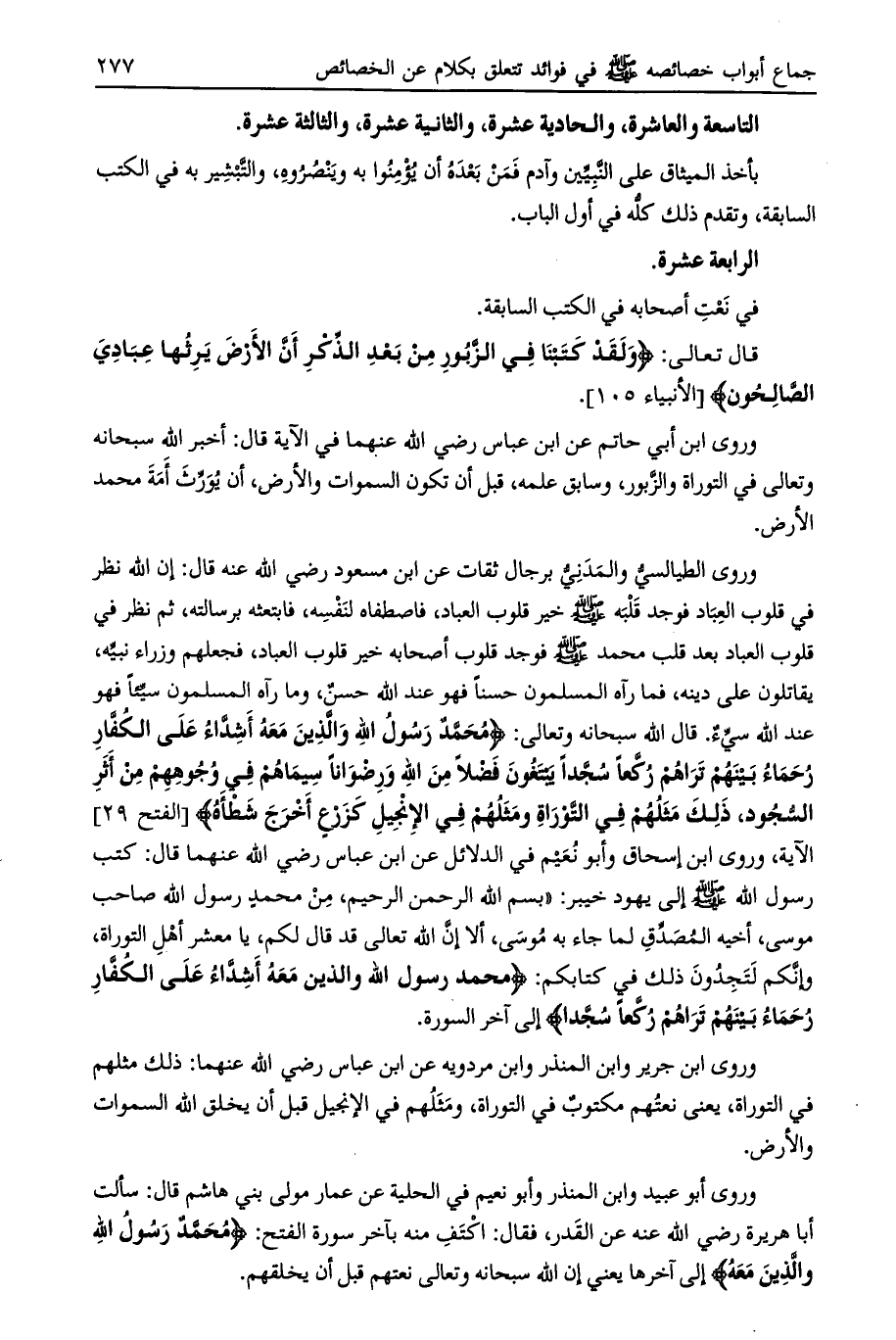 وروى ابن إسحاق وأبو نعيم في الدلائل عن ابن عباس رضي الله عنهما قال: كتب رسول الله صلى الله عليه وسلم إلى يهود خيبر: «بسم الله الرحمن الرحيم، من محمد رسول الله صاحب موسى، أخيه المصدق لما جاء به موسى، ألا إن الله تعالى قد قال لكم، يا معشر أهل التوراة، وإنكم لتجدون ذلك في كتابكم: مُحَمَّدٌ رَسُولُ اللَّهِ وَالَّذِينَ مَعَهُ أَشِدَّاءُ عَلَى الْكُفَّارِ رُحَماءُ بَيْنَهُمْ تَراهُمْ رُكَّعاً سُجَّداً