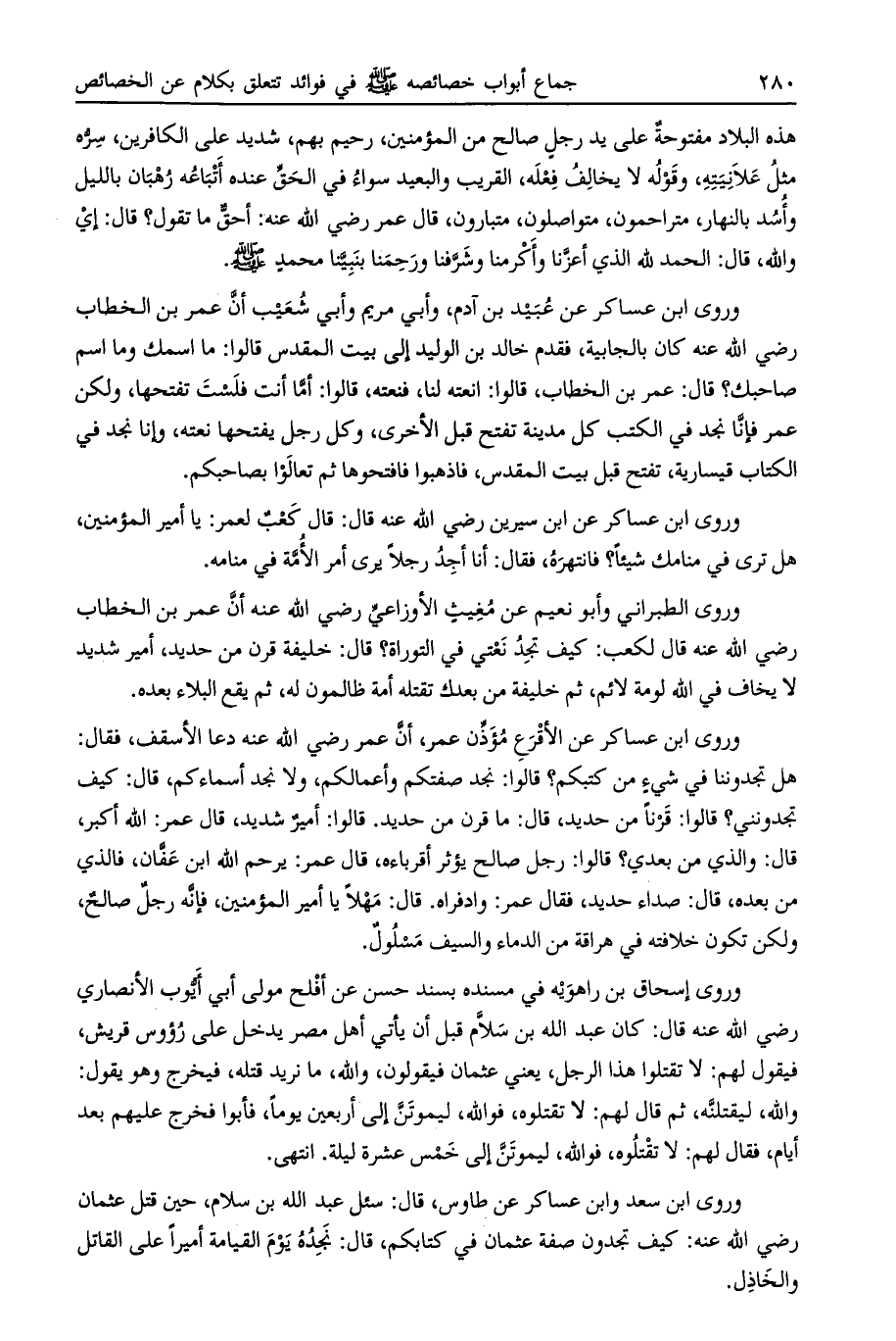 وروى الطبراني وأبو نعيم عن مغيث الأوزاعي رضي الله عنه أن عمر بن الخطاب رضي الله عنه قال لكعب: كيف تجد نعتي في التوراة؟ قال: خليفة قرن من حديد، أمير شديد لا يخاف في الله لومة لائم، ثم خليفة من بعدك تقتله أمة ظالمون له، ثم يقع البلاء بعده.
