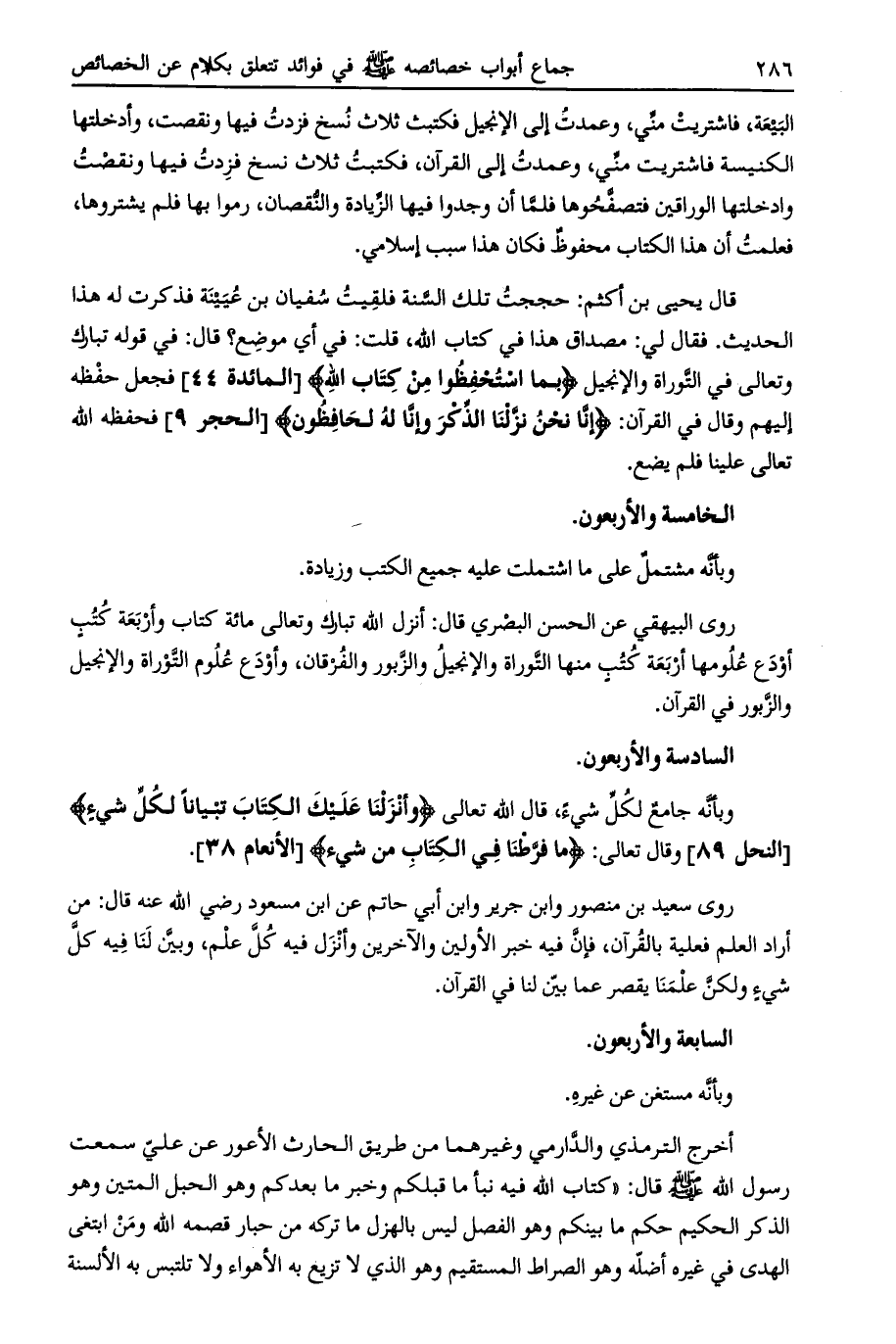 وبأنه جامع لكل شيء، قال الله تعالى وَنَزَّلْنا عَلَيْكَ الْكِتابَ تِبْياناً لِكُلِّ شَيْءٍ [النحل 89] وقال تعالى: ما فَرَّطْنا فِي الْكِتابِ مِنْ شَيْءٍ [الأنعام 38] .