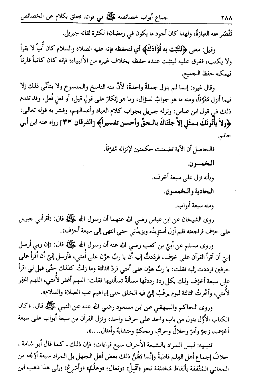 ليس المراد بالسبعة الأحرف سبع قراءات، فإن ذلك- كما قال أبو شامة- خلاف إجماع أهل العلم قاطبة وإنما يظن ذلك بعض أهل الجهل بل المراد سبعة أوجه من المعاني المتفقة بألفاظ مختلفة نحو «أقبل» «وتعال» «وهلم» «وأسرع» وإلى هذا ذهب ابن