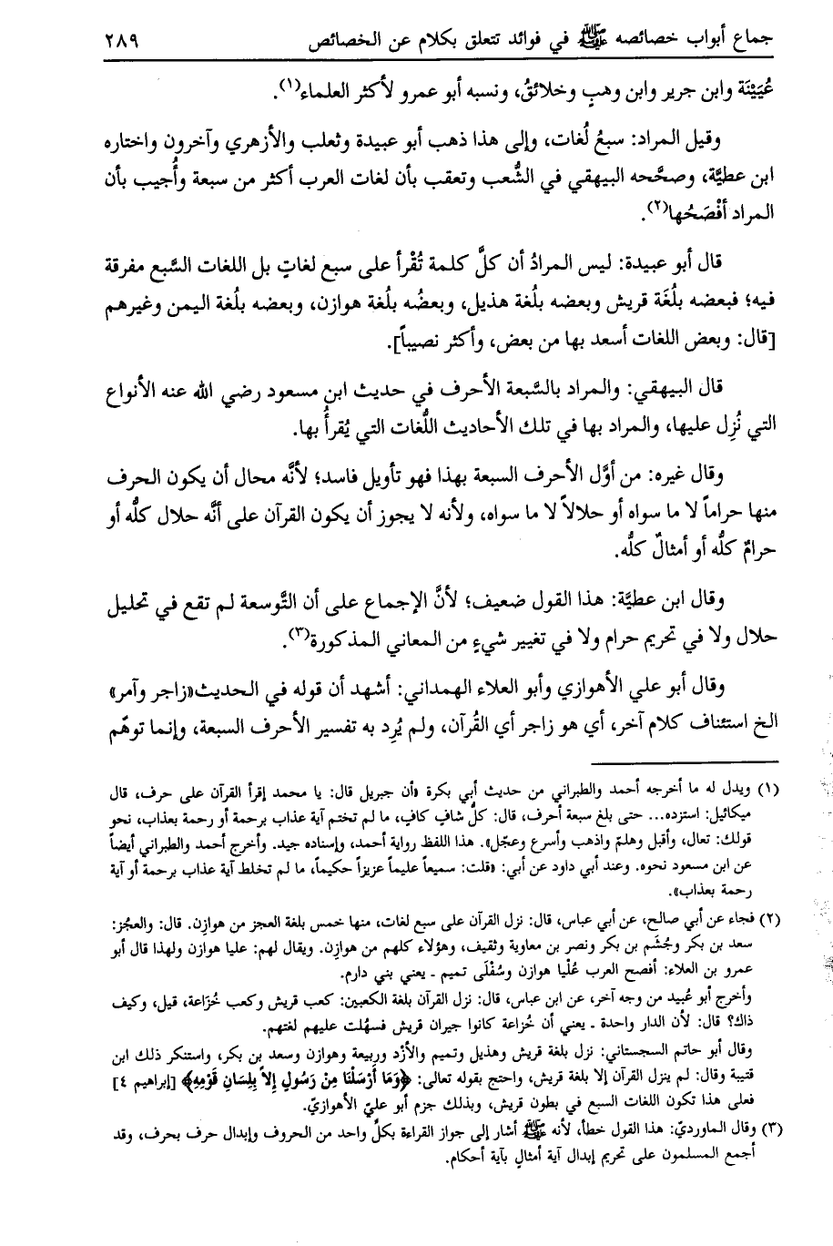 قال أبو عبيدة: ليس المراد أن كل كلمة تقرأ على سبع لغات بل اللغات السبع مفرقة فيه، فبعضه بلغة قريش وبعضه بلغة هذيل، وبعضه بلغة هوازن، وبعضه بلغة اليمن وغيرهم [قال: وبعض اللغات أسعد بها من بعض، وأكثر نصيبا] .