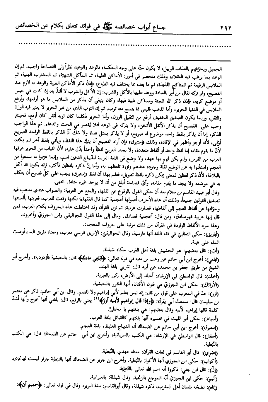 وقال أبو عبيد القاسم بن سلام بعد أن حكى القول بالوقوع عن الفقهاء والمنع عن العربية: والصواب عندي مذهب فيه تصديق القولين جميعا، وذلك أن هذه الأحرف أصولها أعجمية كما قال الفقهاء، لكنها وقعت للعرب، فعربتها بألسنتها وحوّلتها عن ألفاظ العجم إلى ألفاظها، فصارت عربية، ثم نزل القرآن وقد اختلطت هذه الحروف بكلام العرب، فمن قال إنها عربية فهو صادق، ومن قال: أعجمية فصادق. ومال إلى هذا القول الجواليقي وابن الجوزيّ وآخرون.
