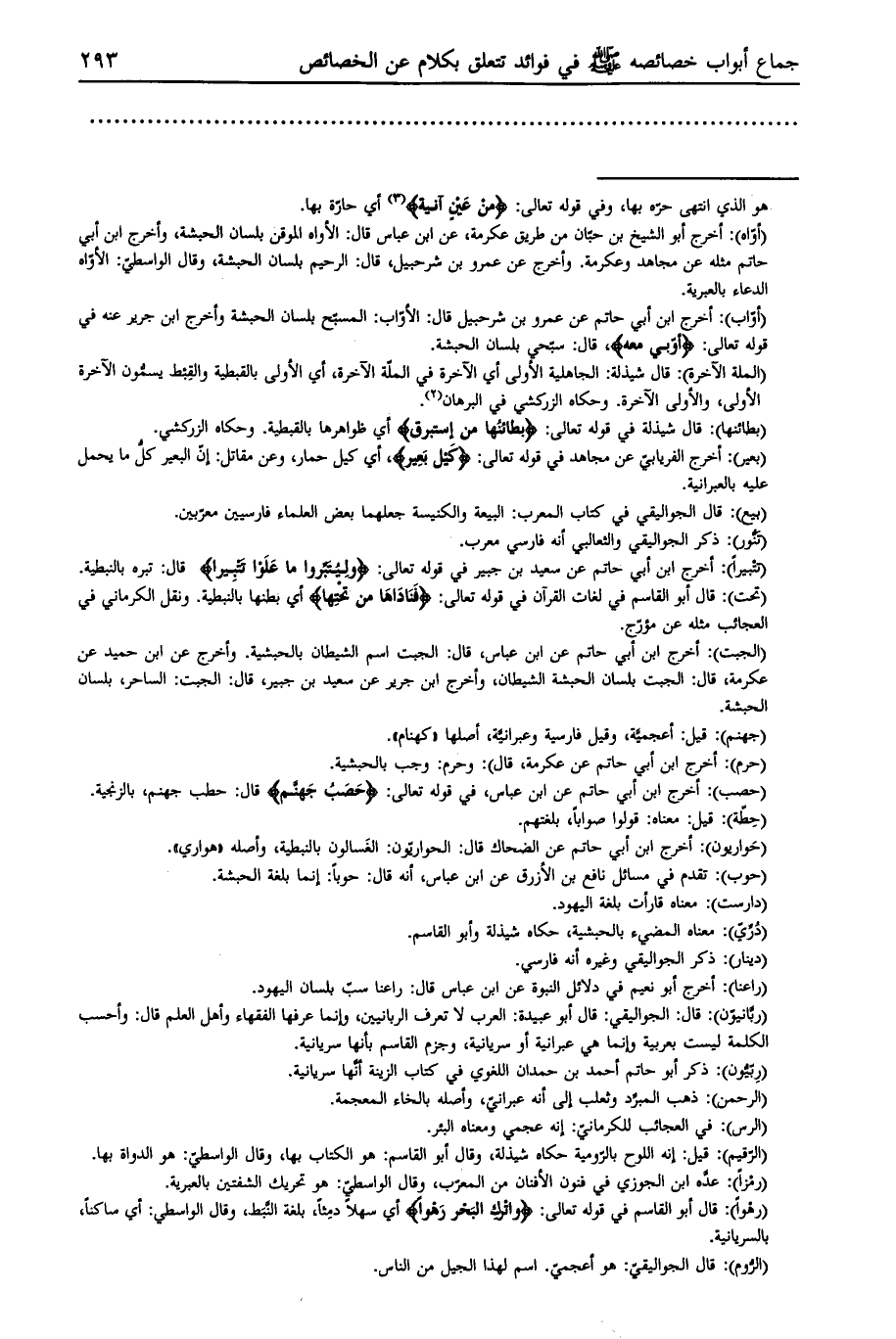 (أوّاب) : أخرج ابن أبي حاتم عن عمرو بن شرحبيل قال: الأوّاب: المسبّح بلسان الحبشة وأخرج ابن جرير عنه في قوله تعالى: أَوِّبِي مَعَهُ، قال: سبّحي بلسان الحبشة.
