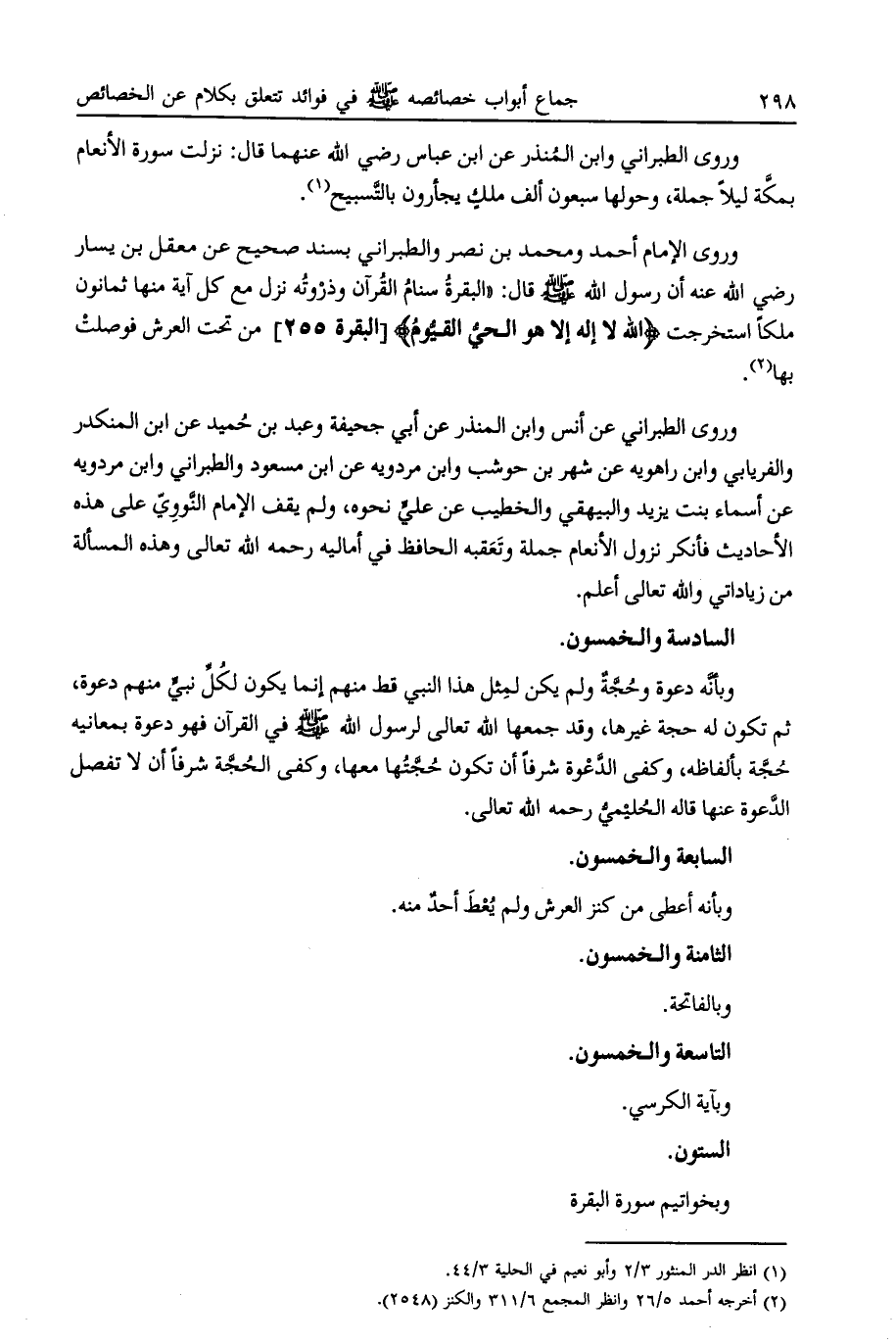 وروى الطبراني عن أنس وابن المنذر عن أبي جحيفة وعبد بن حميد عن ابن المنكدر والفريابي وابن راهويه عن شهر بن حوشب وابن مردويه عن ابن مسعود والطبراني وابن مردويه عن أسماء بنت يزيد والبيهقي والخطيب عن علي نحوه، ولم يقف الإمام النووي على هذه الأحاديث فأنكر نزول الأنعام جملة وتعقبه الحافظ في أماليه رحمه الله تعالى وهذه المسألة من زياداتي والله تعالى أعلم.
