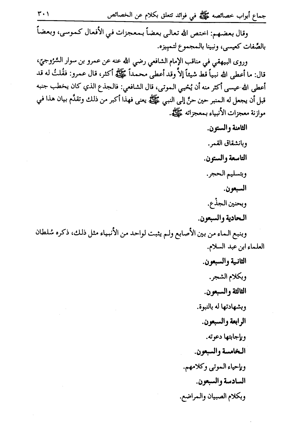 وبنبع الماء من بين الأصابع ولم يثبت لواحد من الأنبياء مثل ذلك، ذكره سلطان العلماء ابن عبد السلام.