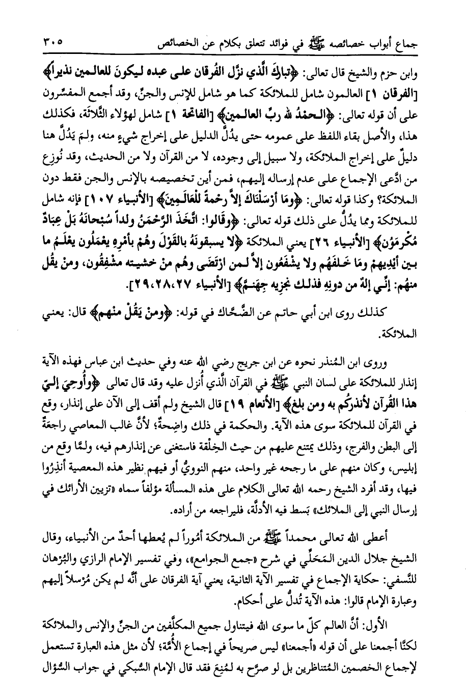 وابن حزم والشيخ قال تعالى: تَبارَكَ الَّذِي نَزَّلَ الْفُرْقانَ عَلى عَبْدِهِ لِيَكُونَ لِلْعالَمِينَ نَذِيراً [الفرقان 1] العالمون شامل للملائكة كما هو شامل للإنس والجن، وقد أجمع المفسرون على أن قوله تعالى: الْحَمْدُ لِلَّهِ رَبِّ الْعالَمِينَ [الفاتحة 2] شامل لهؤلاء الثلاثة، فكذلك هذا، والأصل بقاء اللفظ على عمومه حتى يدل الدليل على إخراج شيء منه، ولم يدل هنا دليل على إخراج الملائكة، ولا سبيل إلى وجوده، لا من القرآن ولا من الحديث، وقد نوزع من ادعى الإجماع على عدم إرساله إليهم، فمن أين تخصيصه بالإنس والجن فقط دون الملائكة؟ وكذا قوله تعالى: وَما أَرْسَلْناكَ إِلَّا رَحْمَةً لِلْعالَمِينَ [الأنبياء 107] فإنه شامل للملائكة ومما يدل على ذلك قوله تعالى: وَقالُوا: اتَّخَذَ الرَّحْمنُ وَلَداً سُبْحانَهُ بَلْ عِبادٌ مُكْرَمُونَ [الأنبياء 26] يعني الملائكة لا يَسْبِقُونَهُ بِالْقَوْلِ وَهُمْ بِأَمْرِهِ يَعْمَلُونَ يَعْلَمُ ما بَيْنَ أَيْدِيهِمْ وَما خَلْفَهُمْ وَلا يَشْفَعُونَ إِلَّا لِمَنِ ارْتَضى وَهُمْ مِنْ خَشْيَتِهِ مُشْفِقُونَ، وَمَنْ يَقُلْ مِنْهُمْ: إِنِّي إِلهٌ مِنْ دُونِهِ فَذلِكَ نَجْزِيهِ جَهَنَّمَ [الأنبياء 27، 28، 29] .