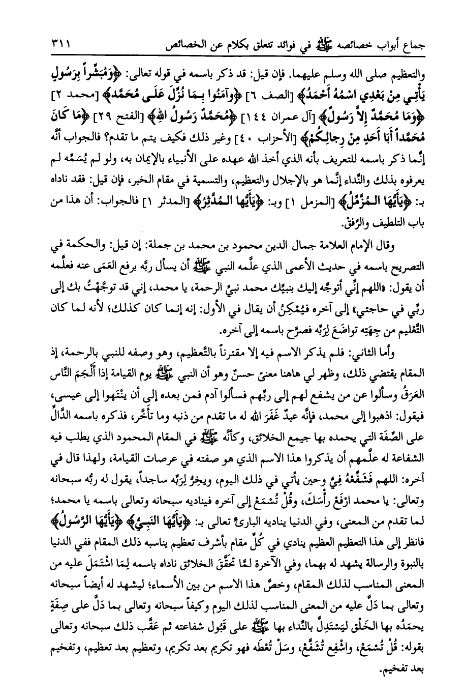 والتعظيم صلى الله وسلم عليهما. فإن قيل: قد ذكر باسمه في قوله تعالى: وَمُبَشِّراً بِرَسُولٍ يَأْتِي مِنْ بَعْدِي اسْمُهُ أَحْمَدُ [الصف 6] وَآمَنُوا بِما نُزِّلَ عَلى مُحَمَّدٍ [محمد 2] وَما مُحَمَّدٌ إِلَّا رَسُولٌ [آل عمران 144] مُحَمَّدٌ رَسُولُ اللَّهِ [الفتح 29] ما كانَ مُحَمَّدٌ أَبا أَحَدٍ مِنْ رِجالِكُمْ [الأحزاب 40] وغير ذلك فكيف يتم ما تقدم؟ فالجواب أنه إنما ذكر باسمه للتعريف بأنه الذي أخذ الله عهده على الأنبياء بالإيمان به، ولو لم يسمه لم يعرفوه بذلك والنداء إنما هو بالإجلال والتعظيم، والتسمية في مقام الخبر، فإن قيل: فقد ناداه ب: يا أَيُّهَا الْمُزَّمِّلُ [المزمل 1] وب: يا أَيُّهَا الْمُدَّثِّرُ [المدثر 1] فالجواب: أن هذا من باب التلطيف والرفق.