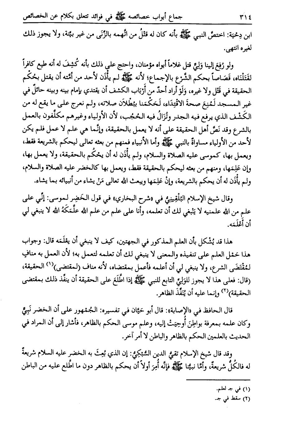 وقد قال شيخ الإسلام تقي الدين السبكي: إن الذي بعث به الخضر عليه السلام شريعة له فالكل شريعة، وأما نبينا صلى الله عليه وسلم فإنه أمر أولا أن يحكم بالظاهر دون ما اطلع عليه من الباطن