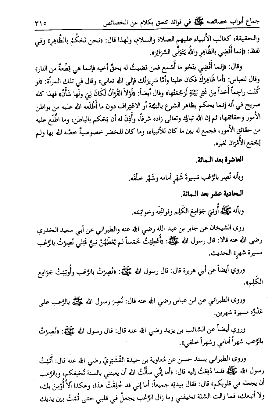 وروى أيضا عن أبي هريرة قال: قال رسول الله صلى الله عليه وسلم: «نصرت بالرعب وأوتيت جوامع الكلم» .