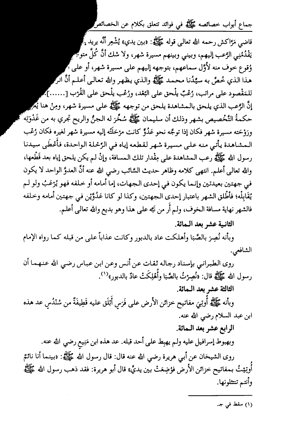 يشعر أنه يريد إذا شرعت في حركة لعدو يقدمني الرعب إليهم، وبيني وبينهم مسيرة شهر، ولا شك أن كل متوجه لقتال قوم لا بد من وقوع خوف منه لأول سماعهم، بتوجهه إليهم على مسيرة شهر، أو على أكثر، أو على أقل، هذا الذي خص به سيدنا محمد صلى الله عليه وسلم والذي يظهر والله تعالى أعلم أن الرعب اللاحق للمقصود على مراتب، رعب يلحق على البعد، ورعب يلحق على القرب [....] . ثم قال: