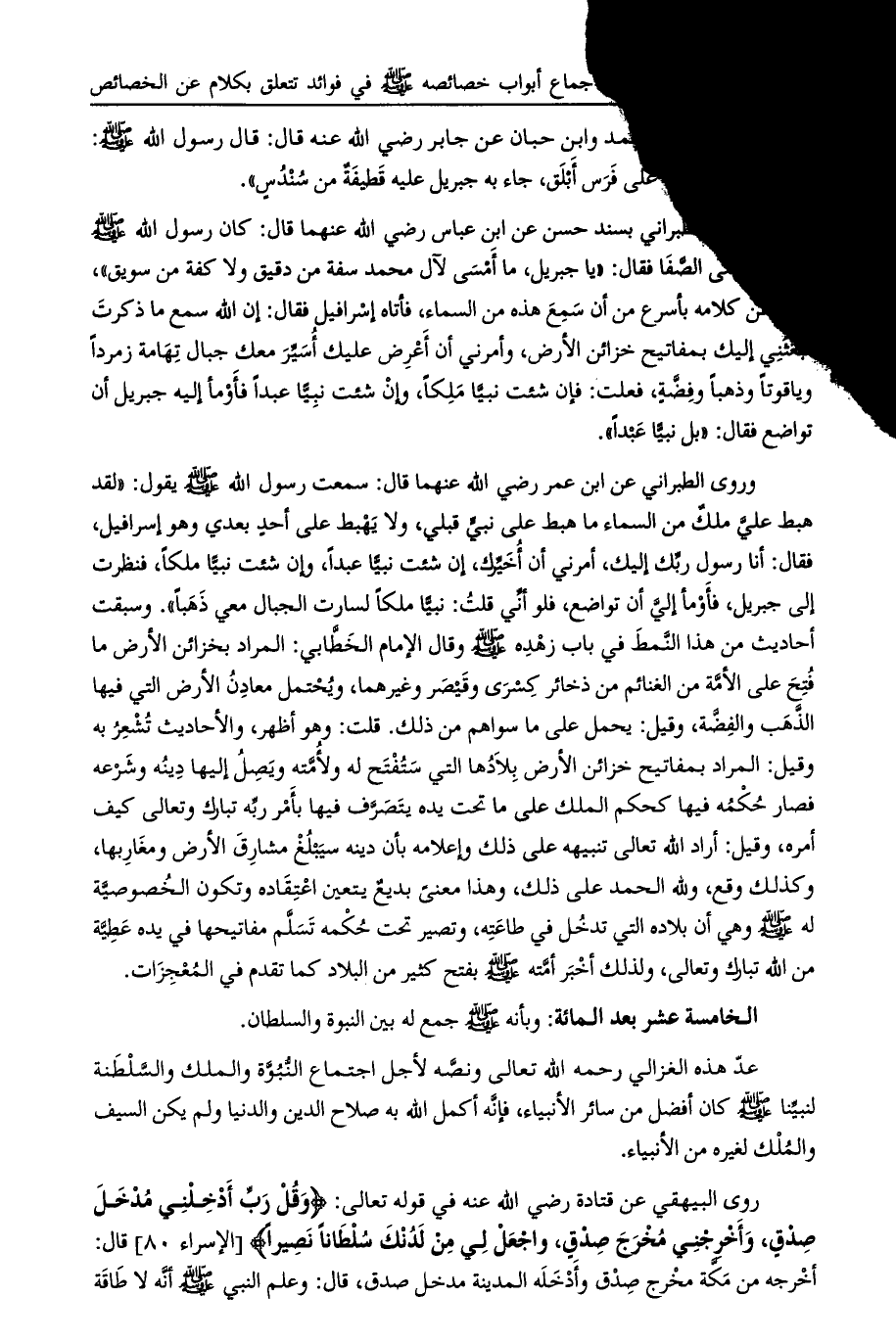 عد هذه الغزالي رحمه الله تعالى ونصه لأجل اجتماع النبوة والملك والسلطنة لنبينا صلى الله عليه وسلم كان أفضل من سائر الأنبياء، فإنه أكمل الله به صلاح الدين والدنيا ولم يكن السيف والملك لغيره من الأنبياء.