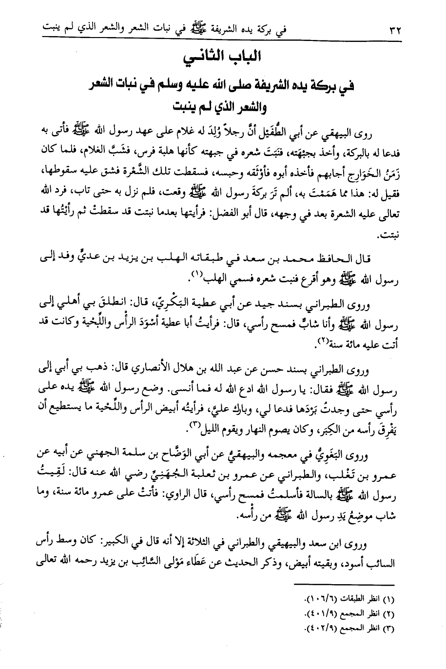 الباب الثاني في بركة يده الشريفة صلى الله عليه وسلم في نبات الشعر والشعر الذي لم ينبت