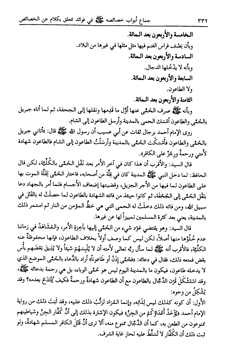 وبأنه صلى الله عليه وسلم صرف الحمى عنها أول ما قدمها ونقلها إلى الجحفة، ثم لما أتاه جبريل بالحمى والطاعون أمسك الحمى بالمدينة وأرسلت الطاعون إلى الشام.