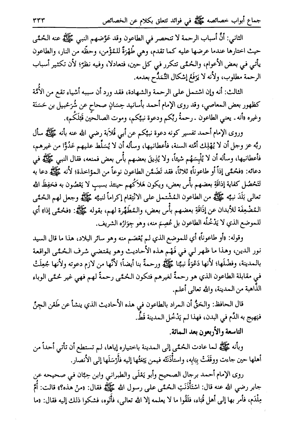 الثاني: أن أسباب الرحمة لا تنحصر في الطاعون وقد عوضهم النبي صلى الله عليه وسلم عنه الحمى حيث اختارها عند ما عرضها عليه كما تقدم، وهي طهرة للمؤمن، وحظه من النار، والطاعون يأتي في بعض الأعوام، والحمى تتكرر في كل حين، فتعادلا، وفيه نظر، لأن تكثير أسباب الرحمة مطلوب، ولأنه لا يرفع إشكال التمدح بعدمه.
