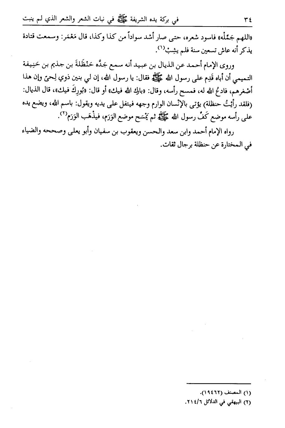 (فلقد رأيت حنظلة) يؤتى بالإنسان الوارم وجهه فيتفل على يديه ويقول: باسم الله، ويضع يده على رأسه موضع كف رسول الله صلى الله عليه وسلم ثم يمسح موضع الورم، فيذهب الورم [ (2) ] .