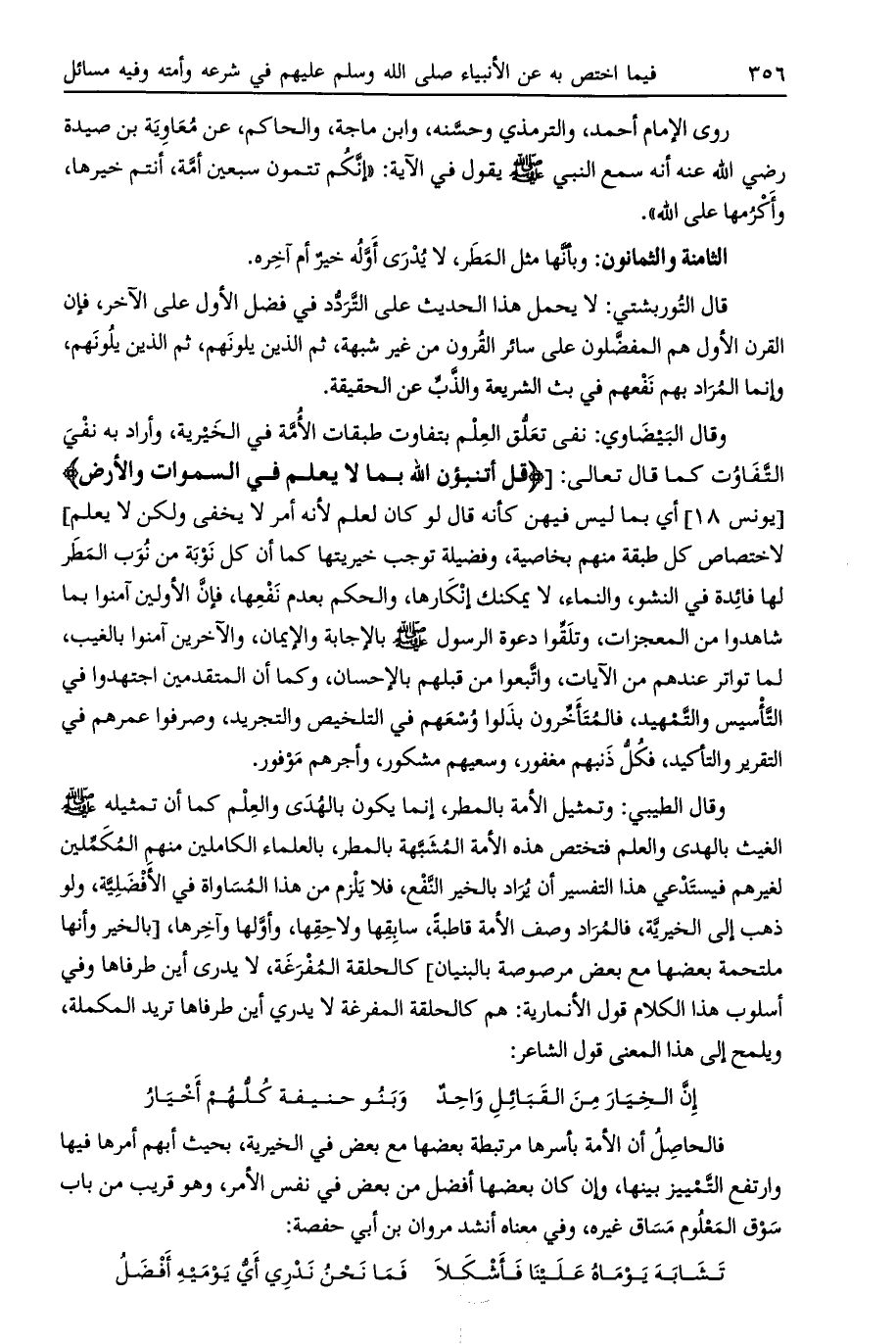 وقال الطيبي: وتمثيل الأمة بالمطر، إنما يكون بالهدى والعلم كما أن تمثيله صلى الله عليه وسلم الغيث بالهدى والعلم فتختص هذه الأمة المشبهة بالمطر، بالعلماء الكاملين منهم المكملين لغيرهم فيستدعي هذا التفسير أن يراد بالخير النفع، فلا يلزم من هذا المساواة في الأفضلية، ولو ذهب إلى الخيرية، فالمراد وصف الأمة قاطبة، سابقها ولاحقها، وأولها وآخرها، [بالخير وأنها ملتحمة بعضها مع بعض مرصوصة بالبنيان] كالحلقة المفرغة، لا يدرى أين طرفاها وفي أسلوب هذا الكلام قول الأنمارية: هم كالحلقة المفرغة لا يدرى أين طرفاها تريد المكملة، ويلمح إلى هذا المعنى قول الشاعر: