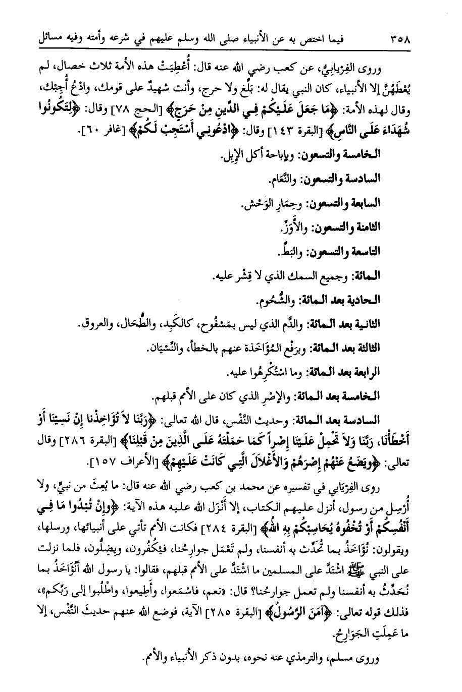 وروى الفريابي، عن كعب رضي الله عنه قال: أعطيت هذه الأمة ثلاث خصال، لم يعطهن إلا الأنبياء، كان النبي يقال له: بلغ ولا حرج، وأنت شهيد على قومك، وادع أجبك، وقال لهذه الأمة: ما جَعَلَ عَلَيْكُمْ فِي الدِّينِ مِنْ حَرَجٍ [الحج 78] وقال: لِتَكُونُوا شُهَداءَ عَلَى النَّاسِ [البقرة 143] وقال: ادْعُونِي أَسْتَجِبْ لَكُمْ [غافر 60] .