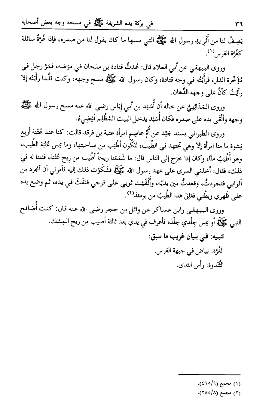 وروى البيهقي عن أبي العلاء قال: عدت قتادة بن ملحان في مرضه، فمر رجل في مؤخرة الدار، فرأيته في وجه قتادة، وكان رسول الله صلى الله عليه وسلم مسح وجهه، وكنت فلمّا رأيته إلا رأيت كأن على وجهه الدهان.