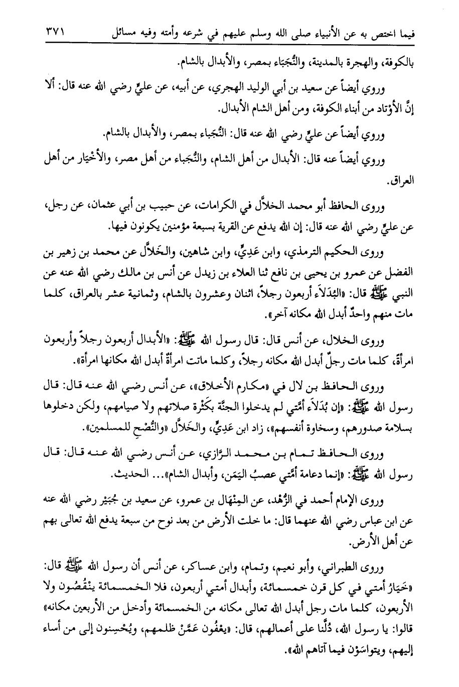 وروى الحكيم الترمذي، وابن عدي، وابن شاهين، والخلال عن محمد بن زهير بن الفضل عن عمرو بن يحيى بن نافع ثنا العلاء بن زيدل عن أنس بن مالك رضي الله عنه عن النبي صلى الله عليه وسلم قال: «البدلاء أربعون رجلا، اثنان وعشرون بالشام، وثمانية عشر بالعراق، كلما مات منهم واحد أبدل الله مكانه آخر» .