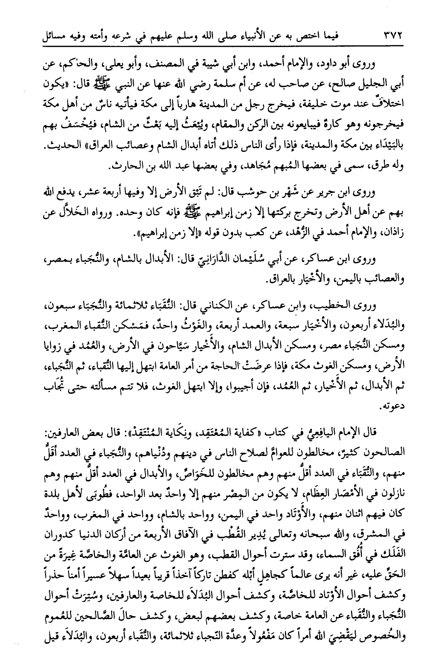 وروى الخطيب، وابن عساكر، عن الكناني قال: النقباء ثلاثمائة والنجباء سبعون، والبدلاء أربعون، والأخيار سبعة، والعمد أربعة، والغوث واحد، فمسكن النقباء المغرب، ومسكن النجباء مصر، ومسكن الأبدال الشام، والأخيار سياحون في الأرض، والعمد في زوايا الأرض، ومسكن الغوث مكة، فإذا عرضت الحاجة من أمر العامة ابتهل إليها النقباء، ثم النجباء، ثم الأبدال، ثم الأخيار، ثم العمد، فإن أجيبوا، وإلا ابتهل الغوث، فلا تتم مسألته حتى تجاب دعوته.