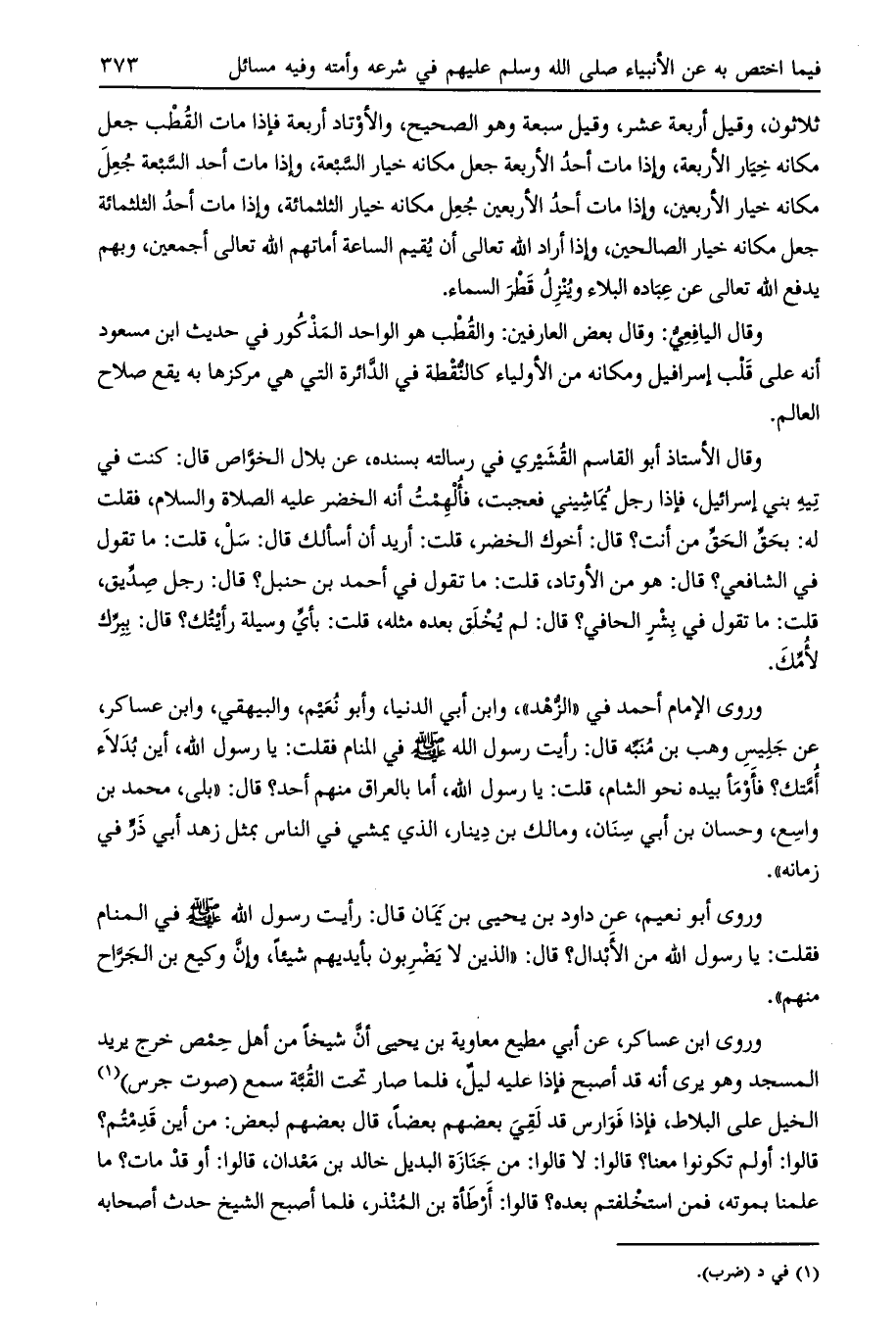 وقال اليافعي: وقال بعض العارفين: والقطب هو الواحد المذكور في حديث ابن مسعود أنه على قلب إسرافيل ومكانه من الأولياء كالنقطة في الدائرة التي هي مركزها به يقع صلاح العالم.