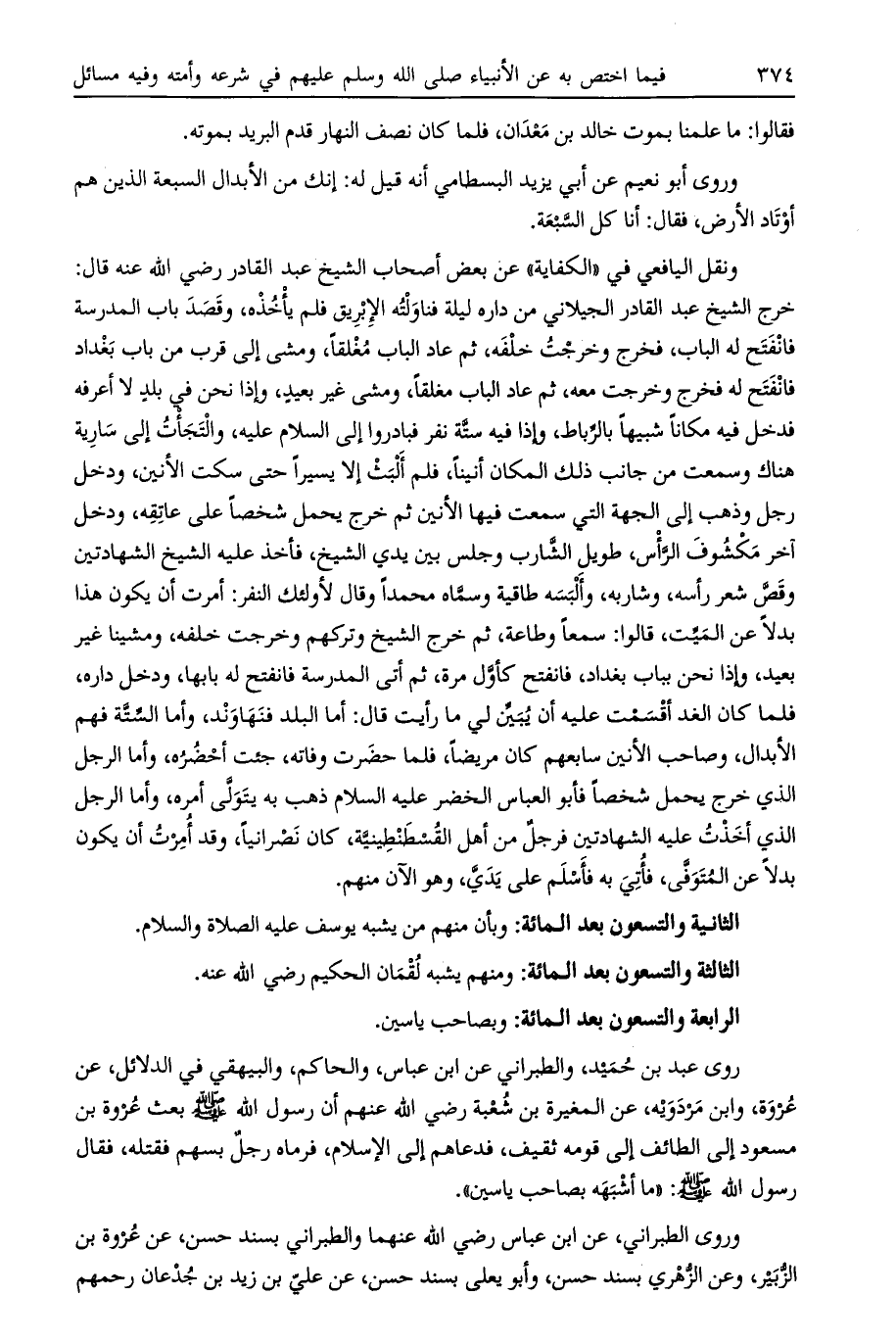 خرج الشيخ عبد القادر الجيلاني من داره ليلة فناولته الإبريق فلم يأخذه، وقصد باب المدرسة فانفتح له الباب، فخرج وخرجت خلفه، ثم عاد الباب مغلقا، ومشى إلى قرب من باب بغداد فانفتح له فخرج وخرجت معه، ثم عاد الباب مغلقا، ومشى غير بعيد، وإذا نحن في بلد لا أعرفه فدخل فيه مكانا شبيها بالرباط، وإذا فيه ستة نفر فبادروا إلى السلام عليه، والتجأت إلى سارية هناك وسمعت من جانب ذلك المكان أنينا، فلم ألبث إلا يسيرا حتى سكت الأنين، ودخل رجل وذهب إلى الجهة التي سمعت فيها الأنين ثم خرج يحمل شخصا على عاتقه، ودخل آخر مكشوف الرأس، طويل الشارب وجلس بين يدي الشيخ، فأخذ عليه الشيخ الشهادتين وقص شعر رأسه، وشاربه، وألبسه طاقية وسماه محمدا وقال لأولئك النفر: أمرت أن يكون هذا بدلا عن الميت، قالوا: سمعا وطاعة، ثم خرج الشيخ وتركهم وخرجت خلفه، ومشينا غير بعيد، وإذا نحن بباب بغداد، فانفتح كأول مرة، ثم أتى المدرسة فانفتح له بابها، ودخل داره، فلما كان الغد أقسمت عليه أن يبين لي ما رأيت قال: أما البلد فنهاوند، وأما الستة فهم الأبدال، وصاحب الأنين سابعهم كان مريضا، فلما حضرت وفاته، جئت أحضره، وأما الرجل الذي خرج يحمل شخصا فأبو العباس الخضر عليه السلام ذهب به يتولى أمره، وأما الرجل الذي أخذت عليه الشهادتين فرجل من أهل القسطنطينية، كان نصرانيا، وقد أمرت أن يكون بدلا عن المتوفى، فأتي به فأسلم على يدي، وهو الآن منهم.