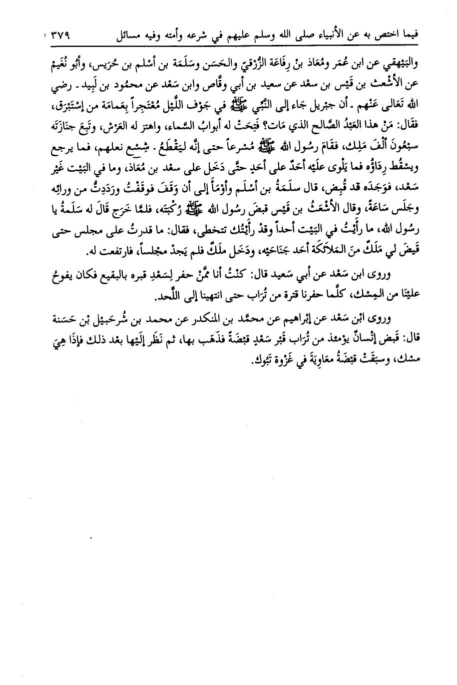 والبيهقي عن ابن عمر ومعاذ بن رفاعة الزرقي والحسن وسلمة بن أسلم بن حريس، وأبو نغيم عن الأشعث بن قيس بن سعد عن سعيد بن أبي وقاص وابن سعد عن محمود بن لبيد- رضي الله تعالى عنهم- أن جبريل جاء إلى النبي صلى الله عليه وسلم في جوف الليل معتجرا بعمامة من استبرق، فقال: من هذا العبد الصالح الذي مات؟ فتحت له أبواب السماء، واهتز له العرش، وتبع جنازته سبعون ألف ملك، فقام رسول الله صلى الله عليه وسلم مسرعا حتى إنه ليقطع. شسع نعلهم، فما يرجع ويسقط رداؤه فما يلوى عليه أحد على أحد حتى دخل على سعد بن معاذ، وما في البيت غير سعد، فوجده قد قبض، قال سلمة بن أسلم وأومأ إلى أن وقف فوقفت ورددت من ورائه وجلس ساعة، وقال الأشعث بن قيس قبض رسول الله صلى الله عليه وسلم ركبته، فلما خرج قال له سلمة يا رسول الله، ما رأيت في البيت أحدا وقد رأيتك تتخطى، فقال: ما قدرت على مجلس حتى قيض لي ملك من الملائكة أحد جناحيه، ودخل ملك فلم يجد مجلسا، فارتفعت له.