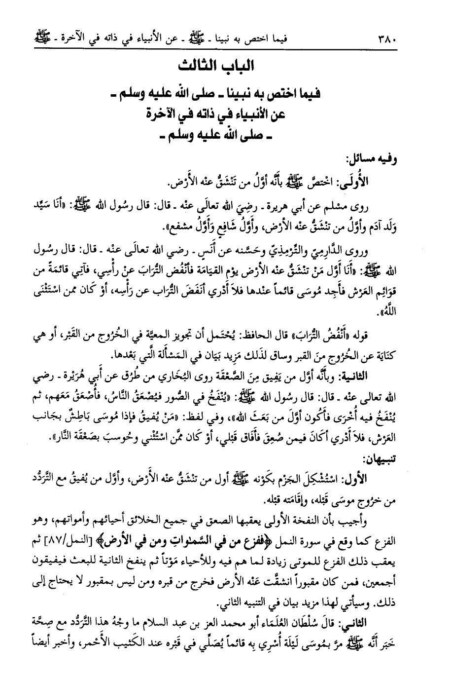الباب الثالث فيما اختص به نبينا- صلى الله عليه وسلم- عن الأنبياء في ذاته في الآخرة- صلى الله عليه وسلم- وفيه مسائل:
