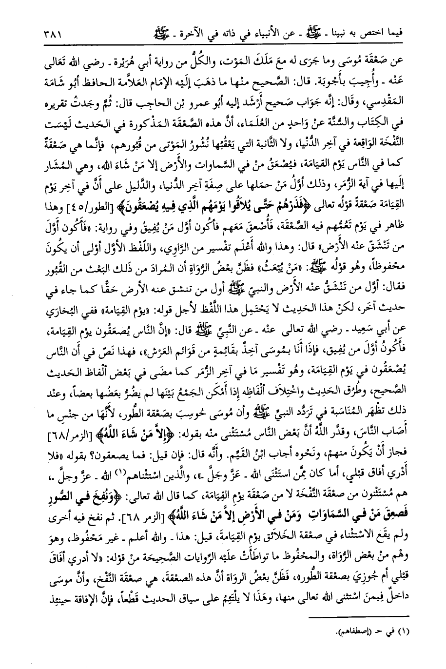 فهذا نص في إن الناس يصعقون في يوم القيامة، وهو تفسير ما في آخر الزمر كما مضى في بعض ألفاظ الحديث الصحيح، وطرق الحديث واختلاف ألفاظه إذا أمكن الجمع بينها لم يضر بعضها بعضا، وعند ذلك تظهر المناسبة في تردد النبي صلى الله عليه وسلم وأن موسى حوسب بصعقة الطور، لأنها من جنس ما أصاب الناس، وقدر الله أن بعض الناس مستثنى منه بقوله: إِلَّا مَنْ شاءَ اللَّهُ [الزمر/ 68] فجاز أن يكون منهم، ونحوه أجاب ابن القيم. وأنه قال: فإن قيل: فما يصعقون؟ بقوله «فلا أدري أفاق قبلي، أما كان ممن استثنى الله- عز وجل» ، والذين استثناهم [ (1) ] الله- عز وجل-، هم مستثنون من صعقة النفخة لا من صعقة يوم القيامة، كما قال الله تعالى: وَنُفِخَ فِي الصُّورِ فَصَعِقَ مَنْ فِي السَّماواتِ وَمَنْ فِي الْأَرْضِ إِلَّا مَنْ شاءَ اللَّهُ