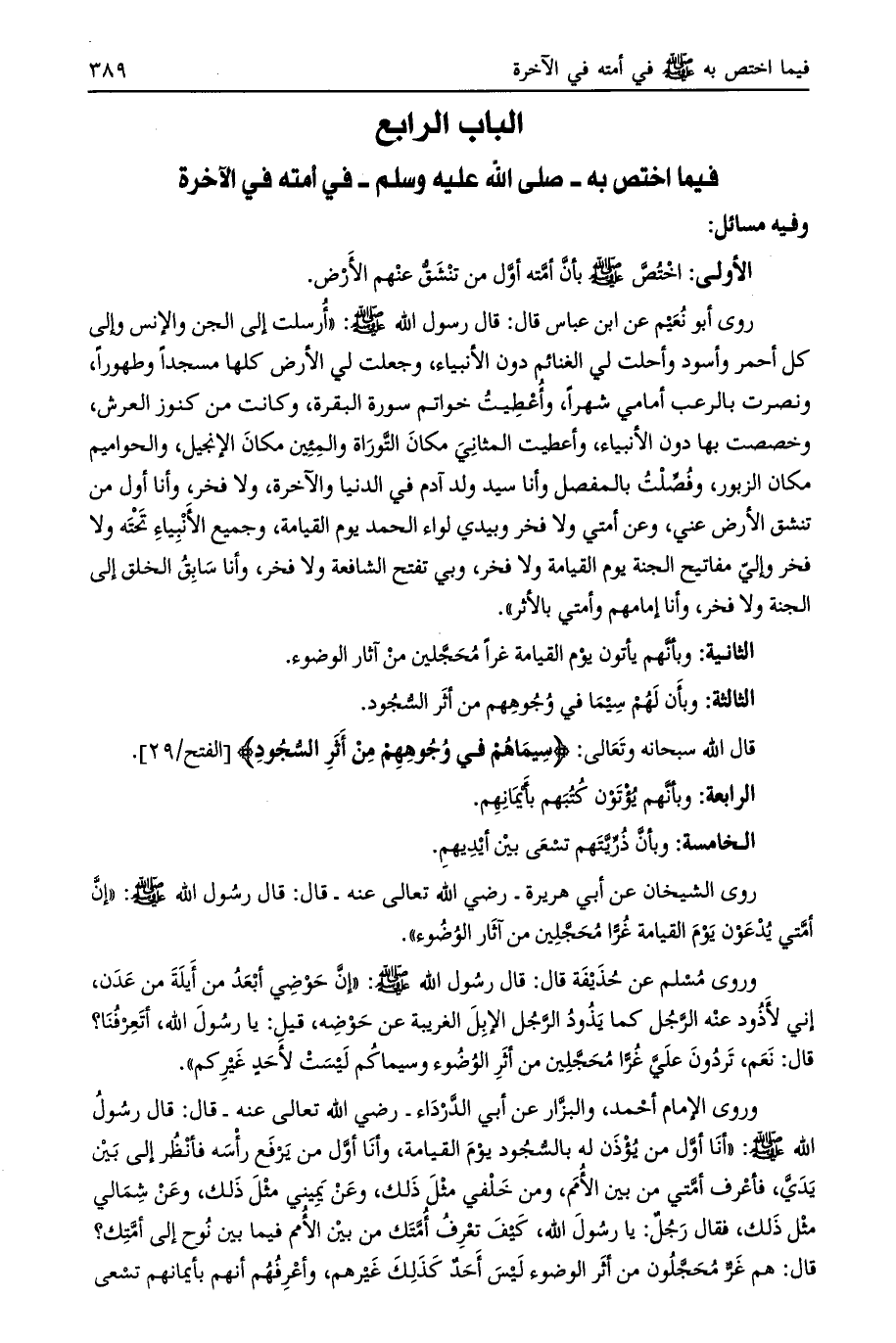 الباب الرابع فيما اختص به- صلى الله عليه وسلم- في أمته في الآخرة وفيه مسائل: