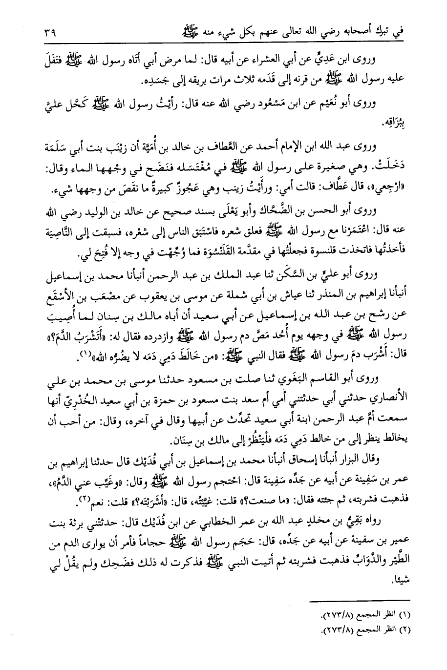 وروى أبو علي بن السكن ثنا عبد الملك بن عبد الرحمن أنبأنا محمد بن إسماعيل أنبأنا إبراهيم بن المنذر ثنا عياش بن أبي شملة عن موسى بن يعقوب عن مصعب بن الأسقع عن رشح بن عبد الله بن إسماعيل عن أبي سعيد أن أباه مالك بن سنان لما أصيب رسول الله صلى الله عليه وسلم في وجهه يوم أحد مص دم رسول الله صلى الله عليه وسلم وازدرده فقال له: «أتشرب الدم؟» قال: أشرب دم رسول الله صلى الله عليه وسلم فقال النبي صلى الله عليه وسلم: «من خالط دمي دمه لا يضره الله» [ (1) ] .