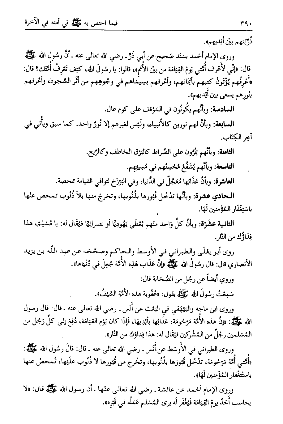 وروى الإمام أحمد بسند صحيح عن أبي ذر- رضي الله تعالى عنه- أن رسول الله صلى الله عليه وسلم قال: «إني لأعرف أمتي يوم القيامة من بين الأمم» ، قالوا: يا رسول الله، كيف تعرف أمتك؟ قال: