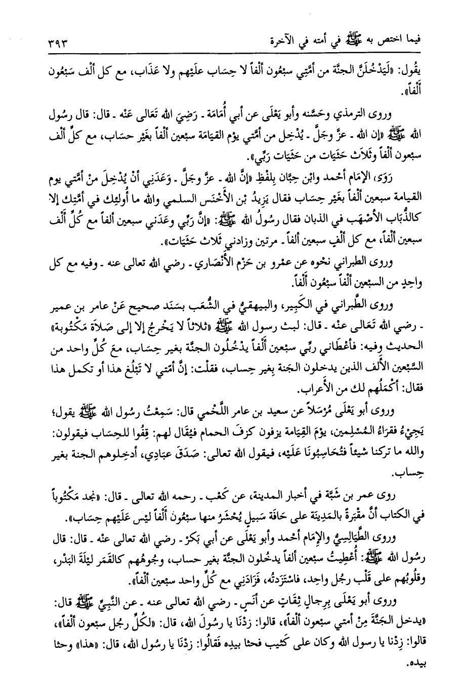 روى الإمام أحمد وابن حبان بلفظ «إن الله- عز وجل- وعدني أن يدخل من أمتي يوم القيامة سبعين ألفا بغير حساب