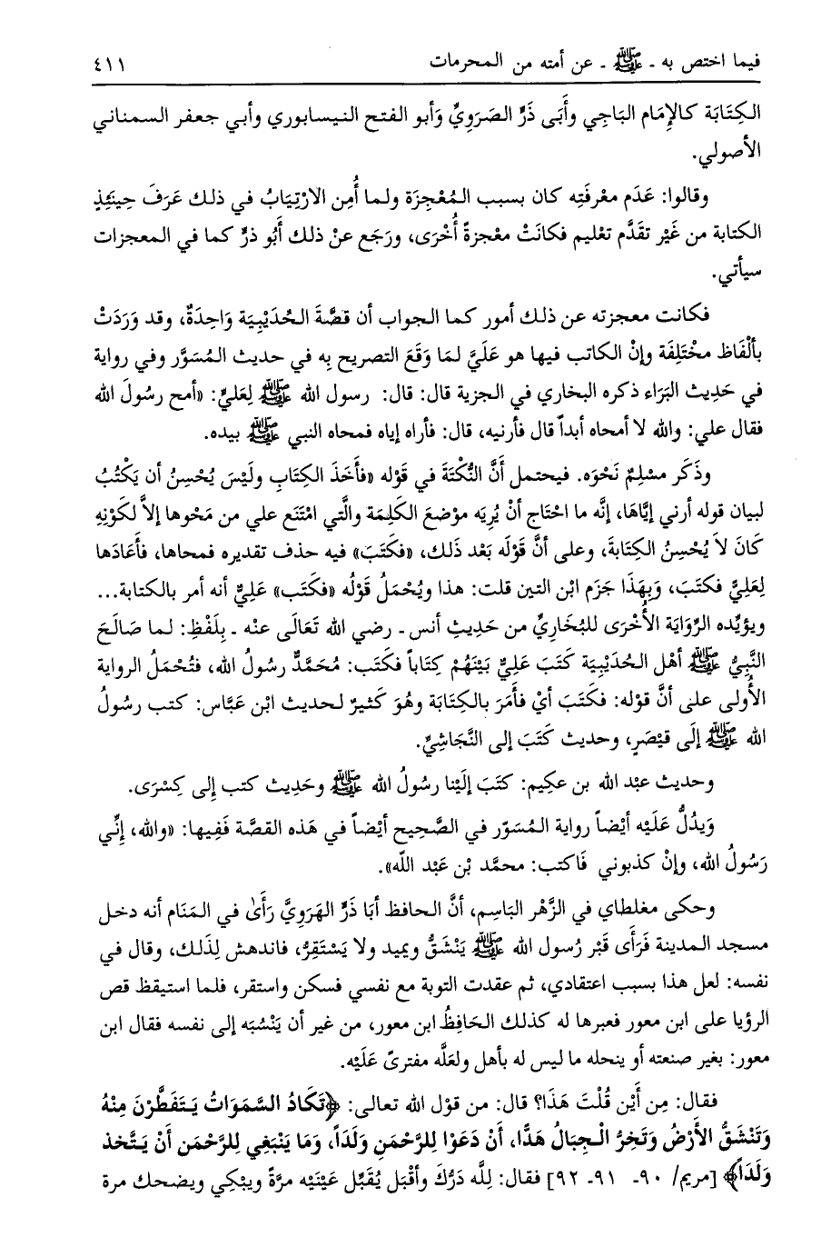 وفي رواية في حديث البراء ذكره البخاري في الجزية قال: قال: رسول الله صلى الله عليه وسلم لعلي: «امح رسول الله فقال علي: والله لا أمحاه أبدا قال فأرنيه، قال: فأراه إياه فمحاه النبي صلى الله عليه وسلم بيده.