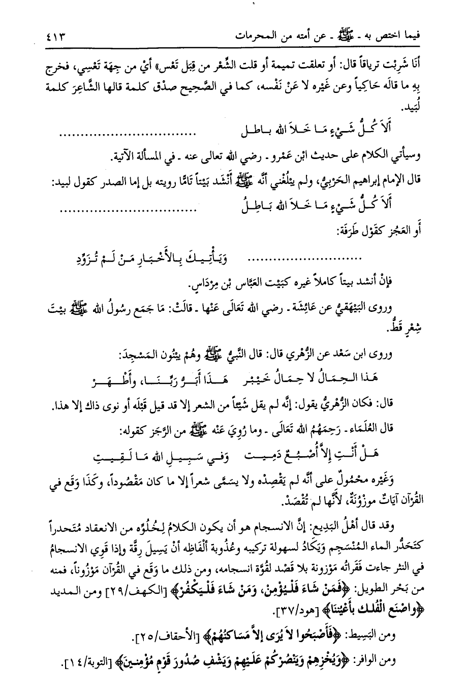 قال الإمام إبراهيم الحربي، ولم يبلغني أنه صلى الله عليه وسلم أنشد بيتا تاما رويته بل إما الصدر كقول لبيد: