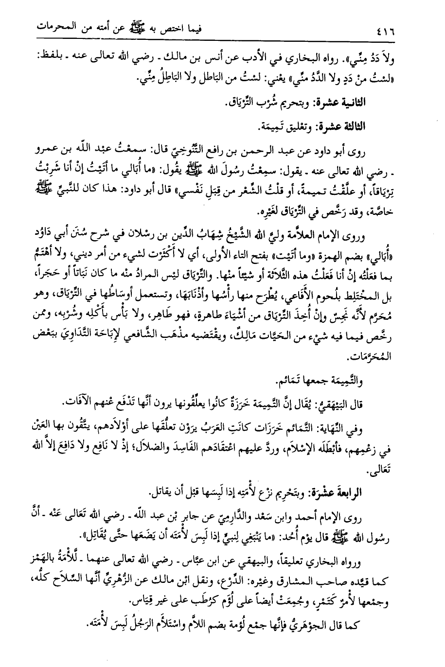وروى الإمام العلامة ولي الله الشيخ شهاب الدين بن رسلان في شرح سنن أبي داود «أبالي» بضم الهمزة «وما أتيت» بفتح التاء الأولى، أي لا أكثرت لشيء من أمر ديني، ولا أهتم بما فعلته إن أنا فعلت هذه الثلاثة أو شيئا منها. والترياق ليس المراد منه ما كان نباتا أو حجرا، بل المختلط بلحوم الأفاعي، يطرح منها رأسها وأذنابها، وتستعمل أوساطها في الترياق، وهو محرم لأنه نجس وإن أخذ الترياق من أشياء طاهرة، فهو طاهر، ولا بأس بأكله وشربه، وممن رخص فيما فيه شيء من الحيات مالك، ويقتضيه مذهب الشافعي لإباحة التداوي ببعض المحرمات.