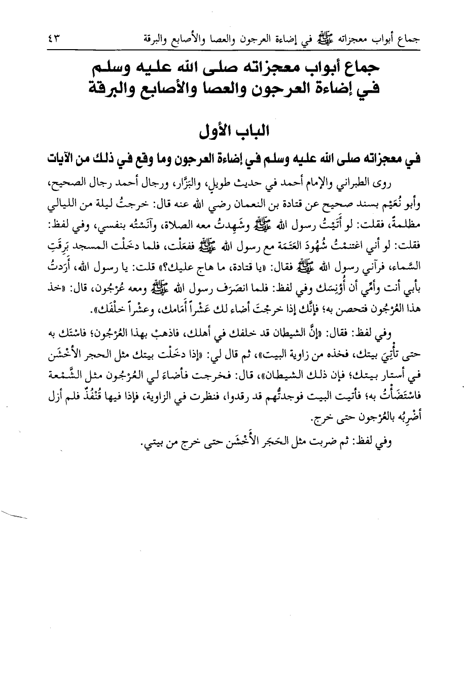جماع أبواب معجزاته صلى الله عليه وسلم في إضاءة العرجون والعصا والأصابع والبرقة