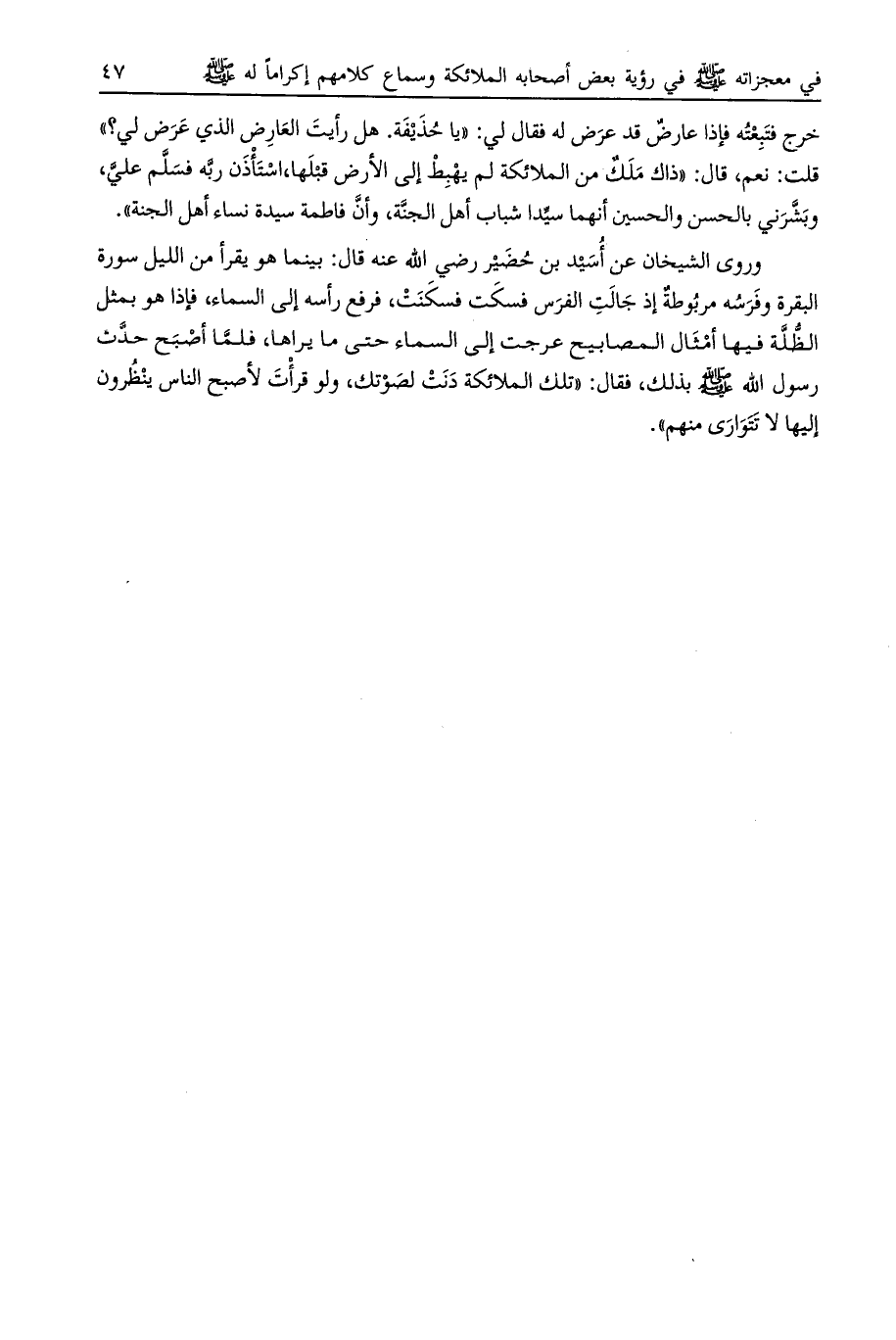 وروى الشيخان عن أسيد بن حضير رضي الله عنه قال: بينما هو يقرأ من الليل سورة البقرة وفرسه مربوطة إذ جالت الفرس فسكت فسكنت، فرفع رأسه إلى السماء، فإذا هو بمثل الظلة فيها أمثال المصابيح عرجت إلى السماء حتى ما يراها، فلما أصبح حدث رسول الله صلى الله عليه وسلم بذلك، فقال: «تلك الملائكة دنت لصوتك، ولو قرأت لأصبح الناس ينظرون إليها لا تتوارى منهم» .