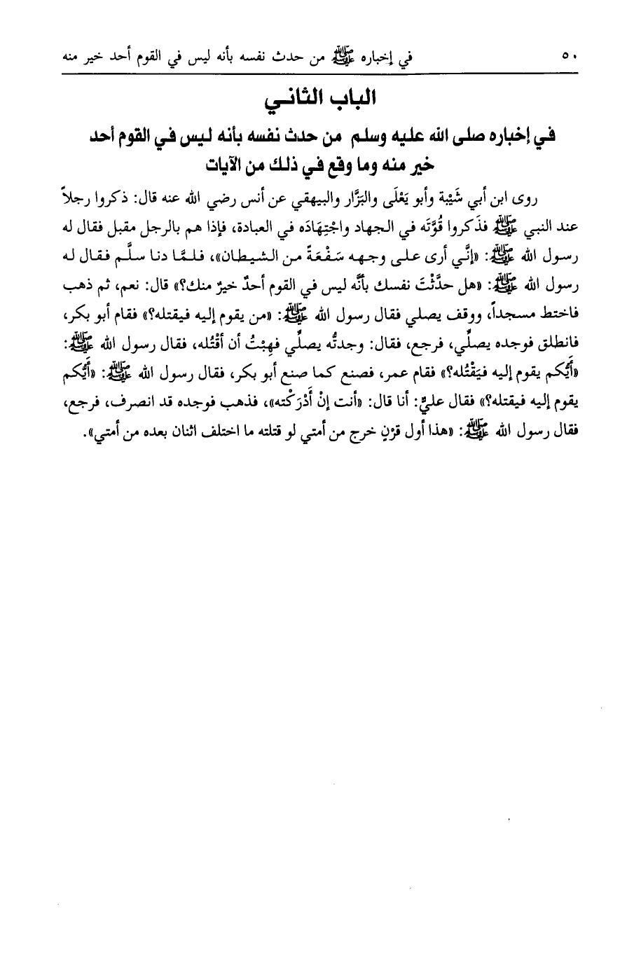 الباب الثاني في إخباره صلى الله عليه وسلم من حدث نفسه بأنه ليس في القوم أحد خير منه وما وقع في ذلك من الآيات