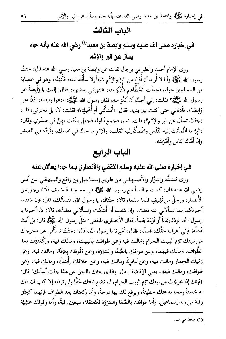 الباب الثالث في إخباره صلى الله عليه وسلم وابصة بن معبد [ (1) ] رضي الله عنه بأنه جاء يسأل عن البر والإثم