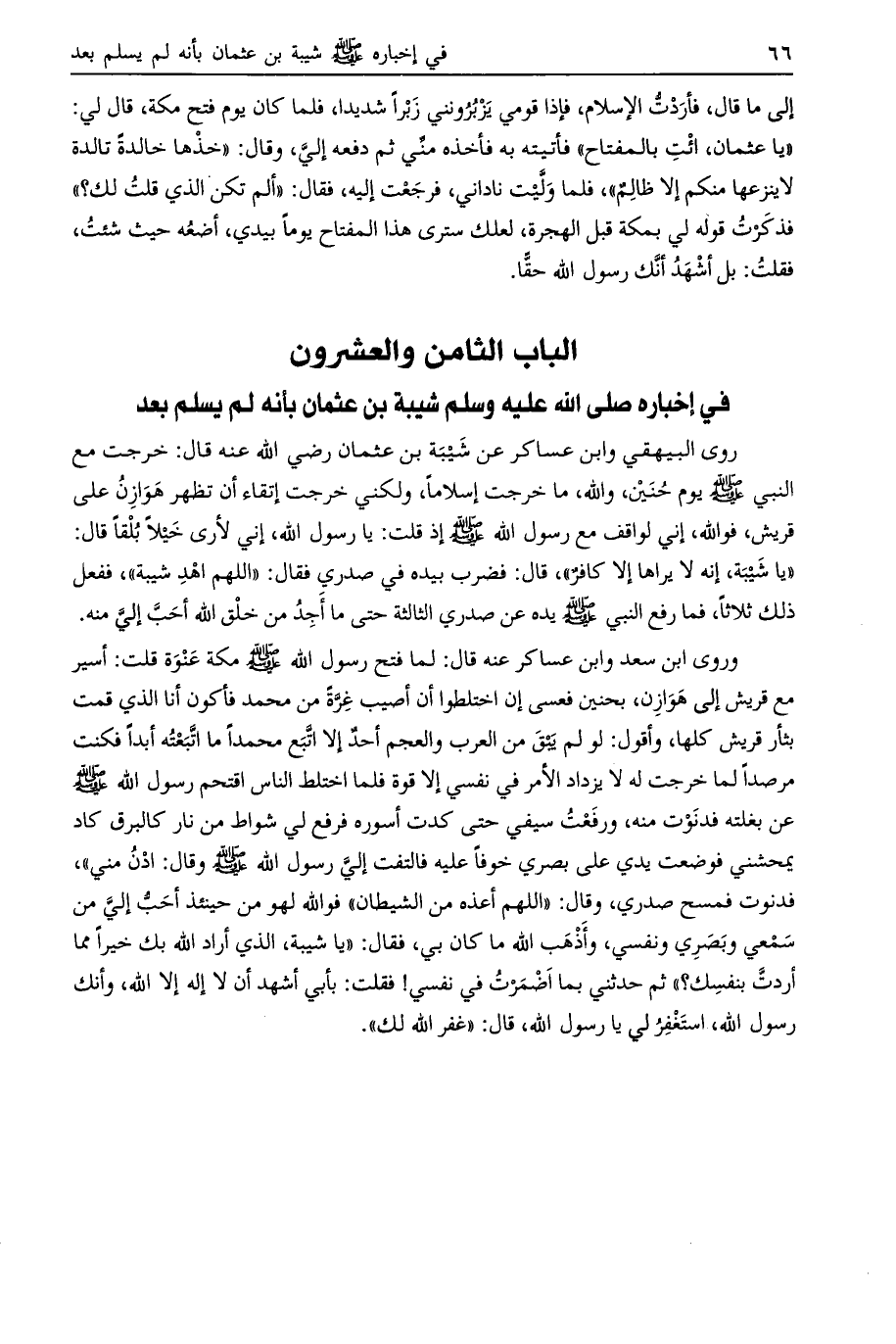 الباب الثامن والعشرون في إخباره صلى الله عليه وسلم شيبة بن عثمان بأنه لم يسلم بعد