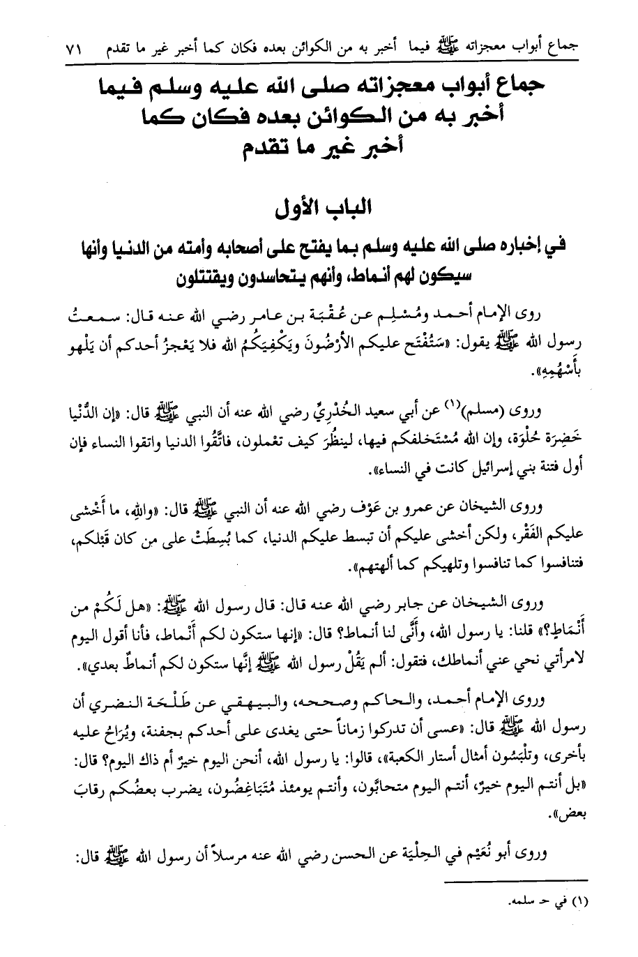 الباب الأول في إخباره صلى الله عليه وسلم بما يفتح على أصحابه وأمته من الدنيا وأنها سيكون لهم أنماط، وأنهم يتحاسدون ويقتتلون